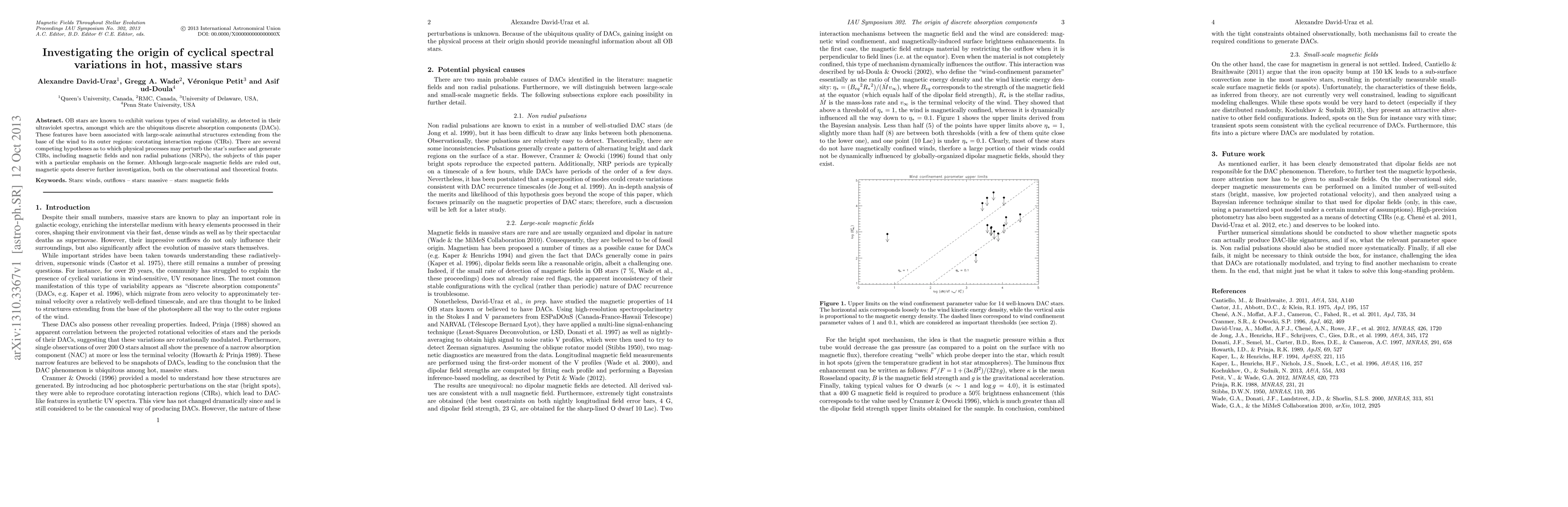 The study investigates cyclical spectral variations in hot, massive stars by analyzing ultraviolet spectra, focusing on discrete absorption components (DACs) associated with corotating interaction regions (CIRs). It distinguishes between large-scale and small-scale magnetic fields as potential causes of DACs, primarily focusing on magnetic fields.