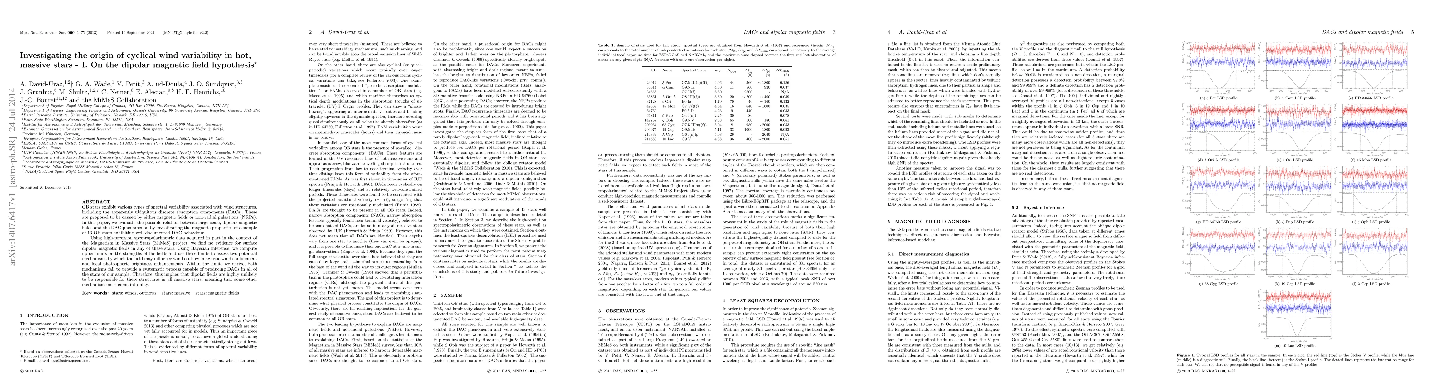 This work distinguishes itself by systematically evaluating the dipolar magnetic field hypothesis against DAC phenomena using high-precision spectropolarimetric data, concluding that dipolar fields are unlikely to be the cause of DACs in massive stars.
