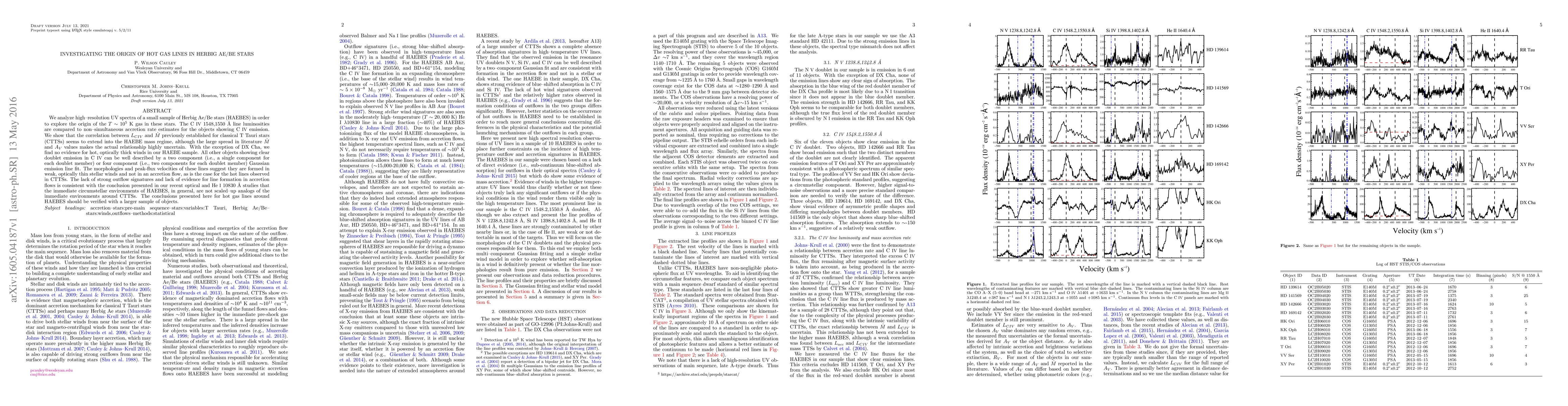 We analyze high-resolution UV spectra of a small sample of Herbig Ae/Be stars (HAEBES) in order to explore the origin of the $T\sim10^5$ K gas in these stars. The C IV 1548,1550 \AA\ line luminosities are compared to non--simultaneous accretion rate estimates for the objects showing C IV emission. We show that the correlation between $L_{CIV}$ and $\dot{M}$ previously established for classical T Tauri stars (CTTSs) seems to extend into the HAEBE mass regime, although the large spread in literature $\dot{M}$ and $A_V$ values makes the actual relationship highly uncertain. With the exception of DX Cha, we find no evidence for hot, optically thick winds in our HAEBE sample. All other objects showing clear doublet emission in C IV can be well described by a two component (i.e., a single component for each doublet member) or four component (i.e., two components for each doublet member) Gaussian emission line fit. The morphologies and peak-flux velocities of these lines suggest they are formed in weak, optically thin stellar winds and not in an accretion flow, as is the case for the hot lines observed in CTTSs. The lack of strong outflow signatures and lack of evidence for line formation in accretion flows is consistent with the conclusion presented in our recent optical and He I 10830 \AA\ studies that the immediate circumstellar environments of HAEBES, in general, are not scaled-up analogs of the immediate environments around CTTSs. The conclusions presented here for hot gas lines around HAEBES should be verified with a larger sample of objects.