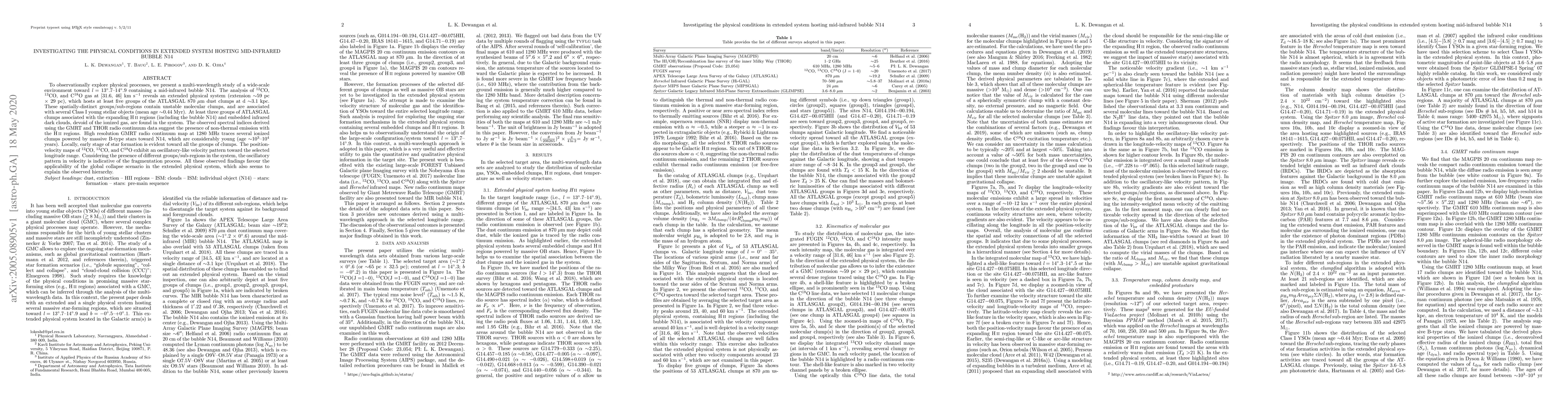 To observationally explore physical processes, we present a multi-wavelength study of a wide-scale environment toward l = 13.7 - 14.9 degrees containing a mid-infrared bubble N14. The analysis of 12CO, 13CO, and C18O gas at [31.6, 46] km/s reveals an extended physical system (extension ~59 pc x 29 pc), which hosts at least five groups of the ATLASGAL 870 micron dust clumps at d ~3.1 kpc. These spatially-distinct groups/sub-regions contain unstable molecular clumps, and are associated with several Class I young stellar objects (mean age ~0.44 Myr). At least three groups of ATLASGAL clumps associated with the expanding HII regions (including the bubble N14) and embedded infrared dark clouds, devoid of the ionized gas, are found in the system. The observed spectral indices derived using the GMRT and THOR radio continuum data suggest the presence of non-thermal emission with the HII regions. High resolution GMRT radio continuum map at 1280 MHz traces several ionized clumps powered by massive B-type stars toward N14, which are considerably young (age ~10^3 - 10^4 years). Locally, early stage of star formation is evident toward all the groups of clumps. The position-velocity maps of 12CO, 13CO, and C18O exhibit an oscillatory-like velocity pattern toward the selected longitude range. Considering the presence of different groups/sub-regions in the system, the oscillatory pattern in velocity is indicative of the fragmentation process. All these observed findings favour the applicability of the global collapse scenario in the extended physical system, which also seems to explain the observed hierarchy.