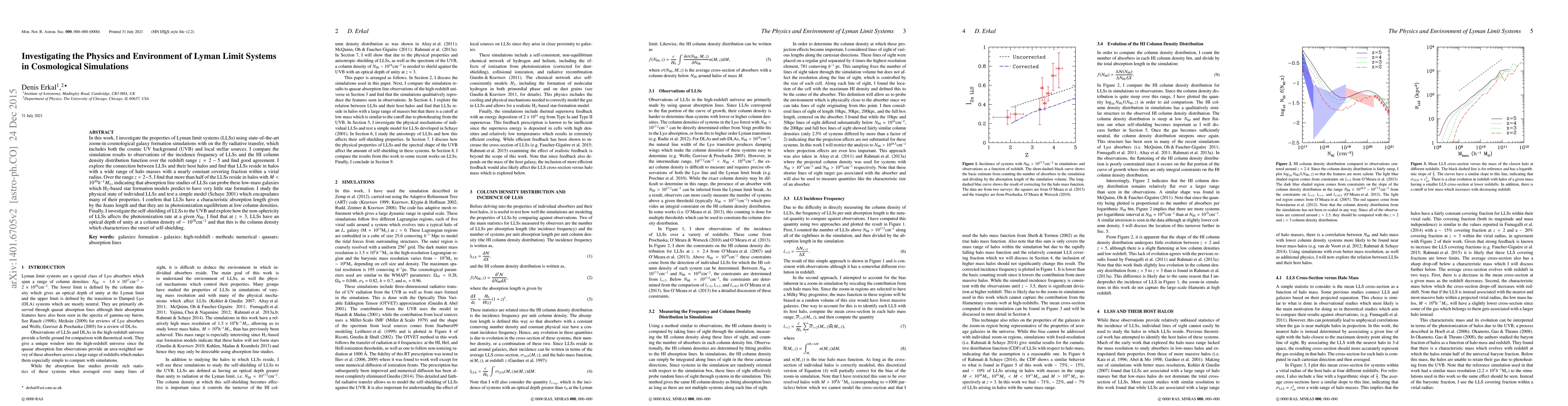In this work, I investigate the properties of Lyman limit systems (LLSs) using state-of-the-art zoom-in cosmological galaxy formation simulations with on the fly radiative transfer, which includes both the cosmic UV background (UVB) and local stellar sources. I compare the simulation results to observations of the incidence frequency of LLSs and the HI column density distribution function over the redshift range $z=2-5$ and find good agreement. I explore the connection between LLSs and their host halos and find that LLSs reside in halos with a wide range of halo masses with a nearly constant covering fraction within a virial radius. Over the range $z=2-5$, I find that more than half of the LLSs reside in halos with $M < 10^{10}h^{-1}M_\odot$, indicating that absorption line studies of LLSs can probe these low-mass galaxies which H$_2$-based star formation models predict to have very little star formation. I study the physical state of individual LLSs and test a simple model (Schaye 2001) which encapsulates many of their properties. I confirm that LLSs have a characteristic absorption length given by the Jeans length and that they are in photoionization equilibrium at low column densities. Finally, I investigate the self-shielding of LLSs to the UVB and explore how the non-sphericity of LLSs affects the photoionization rate at a given $N_{\rm HI}$. I find that at $z\approx 3$, LLSs have an optical depth of unity at a column density of $\sim 10^{18} {\rm cm}^{-2}$ and that this is the column density which characterizes the onset of self-shielding.