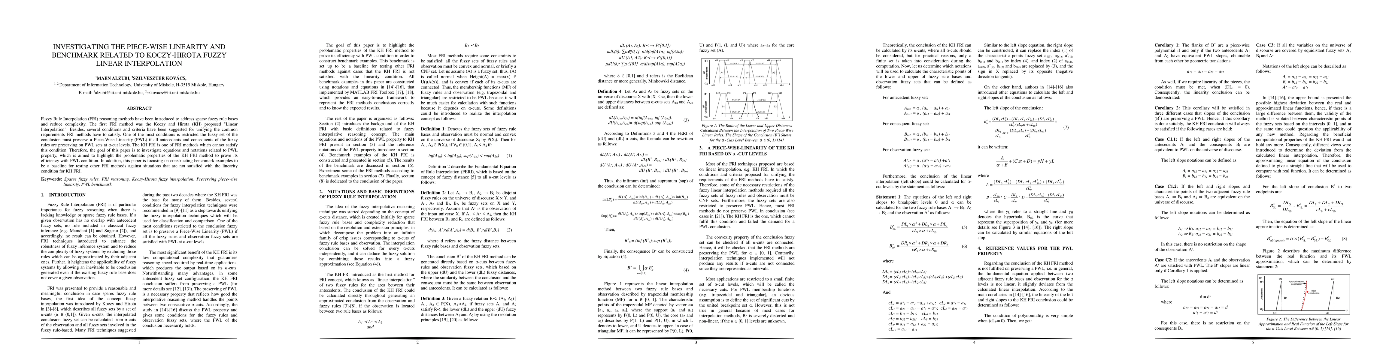 This paper investigates the piece-wise linearity and benchmark conditions for Koczy-Hirota Fuzzy Linear Interpolation (KH FRI) to address its inability to satisfy the PWL requirement. It constructs benchmark examples to evaluate the efficiency of KH FRI against other FRI methods.