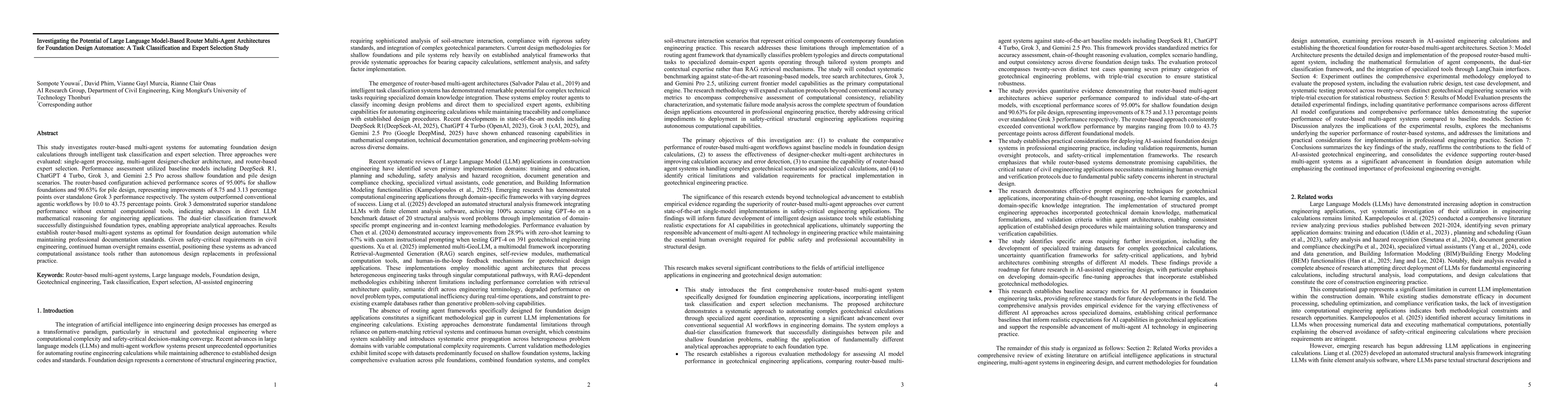 This study investigates router-based multi-agent systems for automating foundation design calculations through intelligent task classification and expert selection. Three approaches were evaluated: single-agent processing, multi-agent designer-checker architecture, and router-based expert selection. Performance assessment utilized baseline models including DeepSeek R1, ChatGPT 4 Turbo, Grok 3, and Gemini 2.5 Pro across shallow foundation and pile design scenarios. The router-based configuration achieved performance scores of 95.00% for shallow foundations and 90.63% for pile design, representing improvements of 8.75 and 3.13 percentage points over standalone Grok 3 performance respectively. The system outperformed conventional agentic workflows by 10.0 to 43.75 percentage points. Grok 3 demonstrated superior standalone performance without external computational tools, indicating advances in direct LLM mathematical reasoning for engineering applications. The dual-tier classification framework successfully distinguished foundation types, enabling appropriate analytical approaches. Results establish router-based multi-agent systems as optimal for foundation design automation while maintaining professional documentation standards. Given safety-critical requirements in civil engineering, continued human oversight remains essential, positioning these systems as advanced computational assistance tools rather than autonomous design replacements in professional practice.