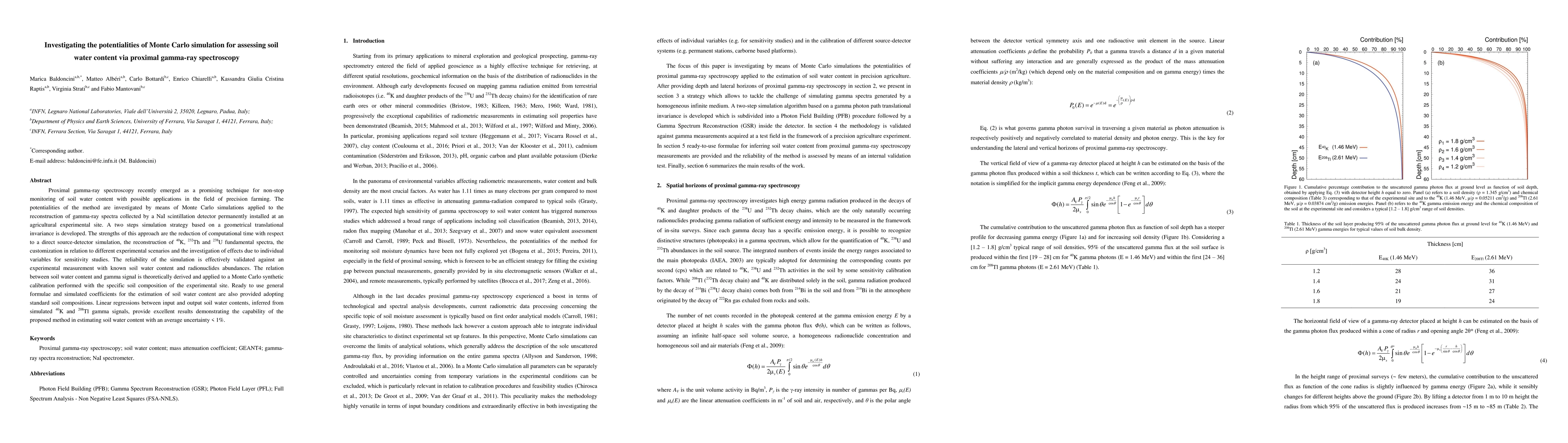 This paper investigates the use of Monte Carlo simulations to assess soil water content via proximal gamma-ray spectroscopy, demonstrating a two-step simulation strategy to reconstruct gamma-ray spectra. The method shows high accuracy in estimating soil water content with an average uncertainty of less than 1%, validated against experimental measurements.
