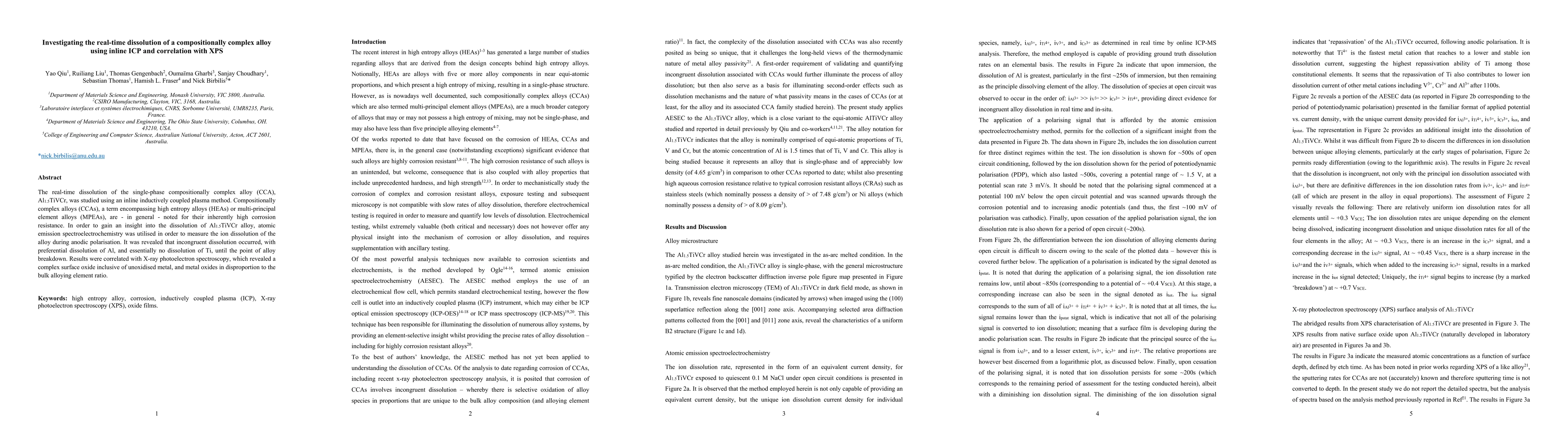 This study investigates the real-time dissolution of the compositionally complex alloy Al1.5TiVCr using inline inductively coupled plasma, revealing preferential dissolution of Al and minimal dissolution of Ti. Results correlate with XPS findings showing a complex surface oxide layer with metal and metal oxides not in proportion to the alloy's bulk composition.
