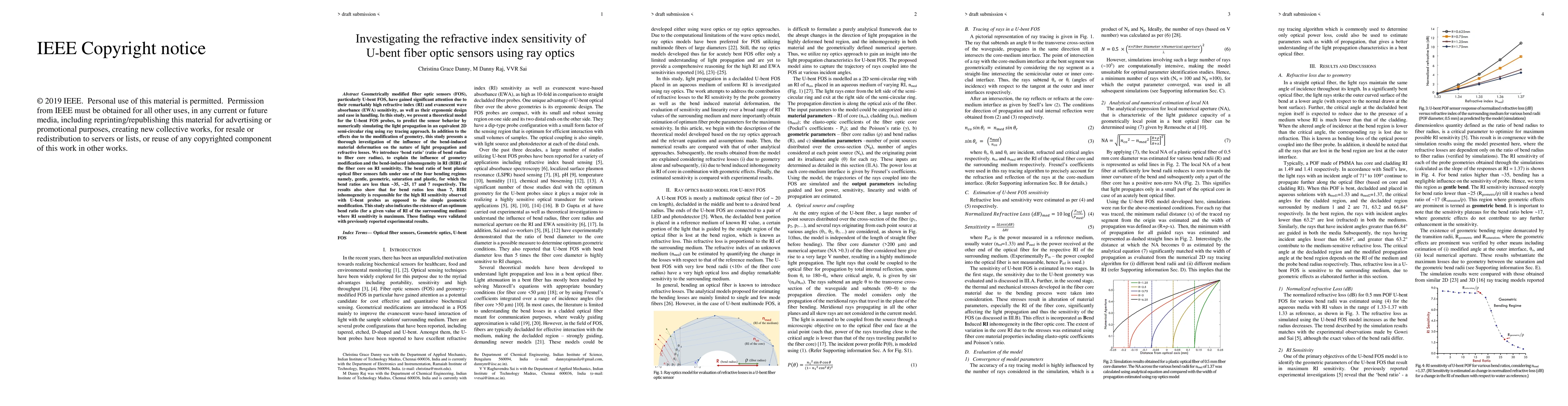 Geometrically modified fiber optic sensors (FOS), particularly U-bent FOS, have gained significant attention due to their remarkably high refractive index (RI) and evanescent wave absorbance (EWA) sensitivity, as well as their ergonomic design and ease in handling. In this study, we present a theoretical model for the U-bent FOS probes, to predict the sensor behavior by numerically simulating the light propagation in an equivalent 2D semi-circular ring using ray tracing approach. In addition to the effects due to the modification of geometry, this study presents a thorough investigation of the influence of the bend-induced material deformation on the nature of light propagation and refractive losses. We introduce bend ratio (ratio of bend radius to fiber core radius), to explain the influence of geometry modification and the bend-induced inhomogeneity in RI (BIRI) of the fiber core on RI sensitivity. The bend ratio of bent plastic optical fiber sensors falls under one of the four bending regimes namely, gentle, geometric, saturation and plastic, for which the bend ratios are less than 35, 25, 17 and 7 respectively. The results also show that for bend ratios less than 7, BIRI inhomogeneity is responsible for the high RI sensitivity observed with U-bent probes as opposed to the simple geometric modification. This study also indicates the existence of an optimum bend ratio (for a given value of RI of the surrounding medium) where RI sensitivity is maximum. These findings were validated with previously reported experimental results.