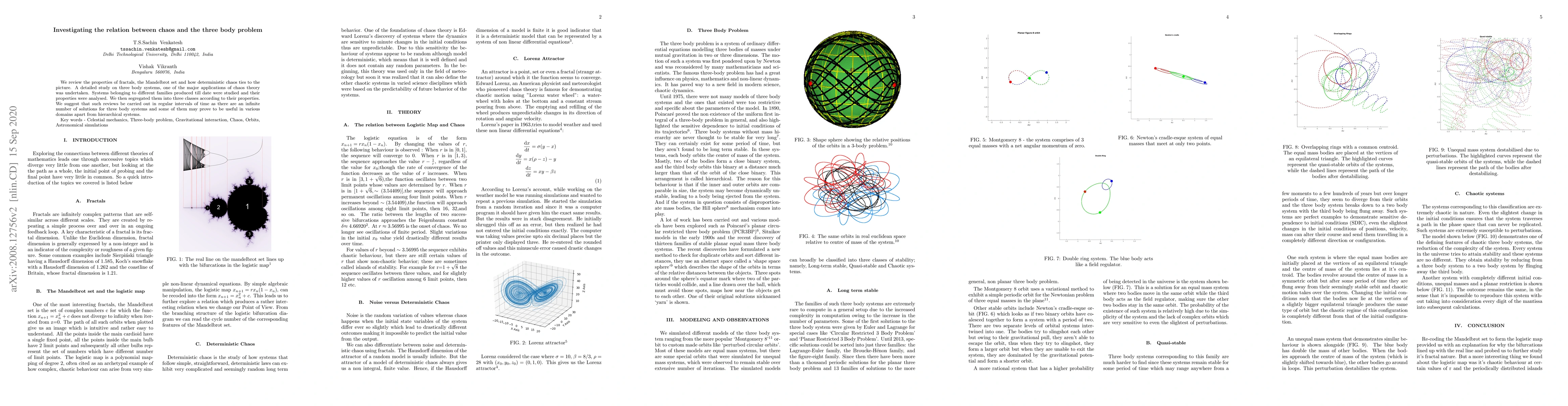 We review the properties of fractals, the Mandelbrot set and how deterministic chaos ties to the picture. A detailed study on three body systems, one of the major applications of chaos theory was undertaken. Systems belonging to different families produced till date were studied and their properties were analysed. We then segregated them into three classes according to their properties. We suggest that such reviews be carried out in regular intervals of time as there are an infinite number of solutions for three body systems and some of them may prove to be useful in various domains apart from hierarchical systems.