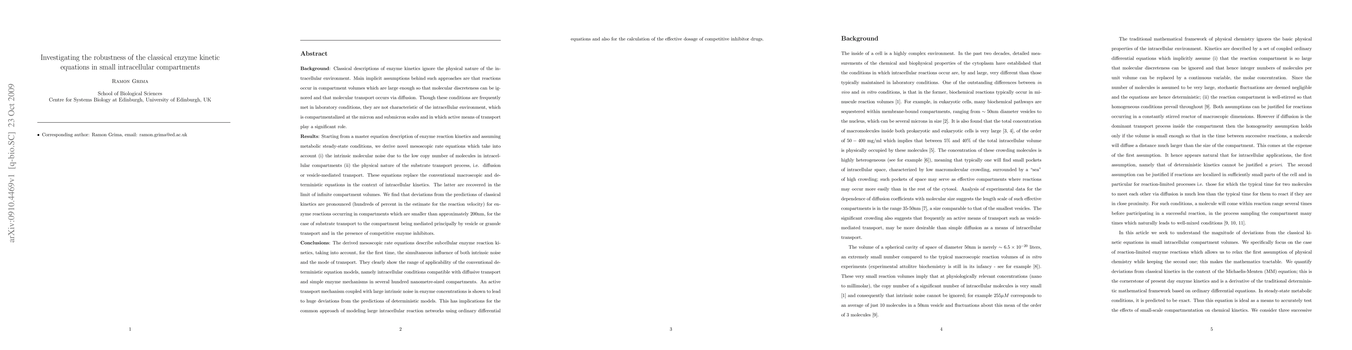 This paper develops mesoscopic rate equations to describe enzyme kinetics in small intracellular compartments, revealing significant deviations from classical kinetic models due to molecular noise and non-diffusive transport mechanisms. The findings suggest substantial errors in predicting reaction rates for compartments smaller than 200nm, impacting both intracellular network modeling and competitive inhibitor drug dosage calculations.