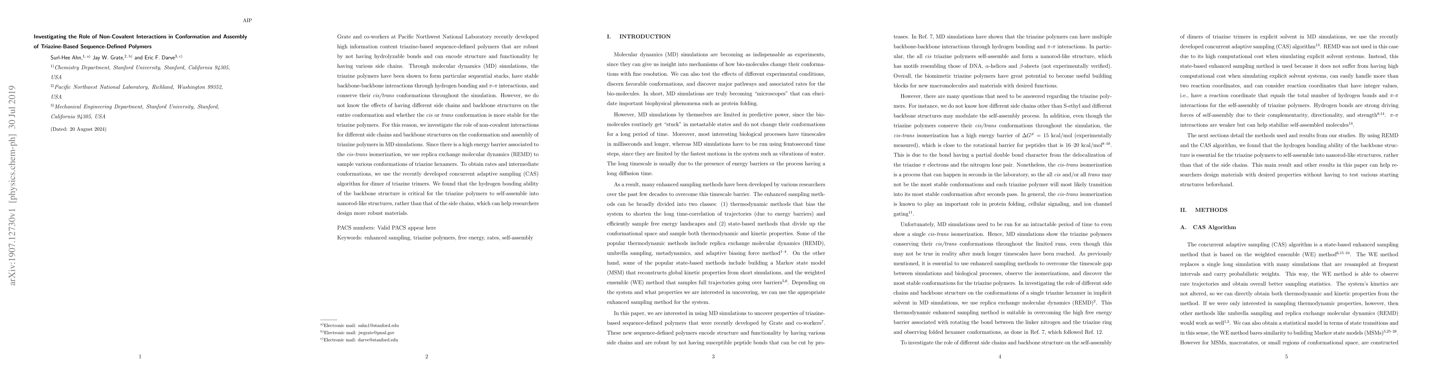 Grate and co-workers at Pacific Northwest National Laboratory recently developed high information content triazine-based sequence-defined polymers that are robust by not having hydrolyzable bonds and can encode structure and functionality by having various side chains. Through molecular dynamics (MD) simulations, the triazine polymers have been shown to form particular sequential stacks, have stable backbone-backbone interactions through hydrogen bonding and $\pi$-$\pi$ interactions, and conserve their \emph{cis/trans} conformations throughout the simulation. However, we do not know the effects of having different side chains and backbone structures on the entire conformation and whether the \emph{cis} or \emph{trans} conformation is more stable for the triazine polymers. For this reason, we investigate the role of non-covalent interactions for different side chains and backbone structures on the conformation and assembly of triazine polymers in MD simulations. Since there is a high energy barrier associated to the \emph{cis}-\emph{trans} isomerization, we use replica exchange molecular dynamics (REMD) to sample various conformations of triazine hexamers. To obtain rates and intermediate conformations, we use the recently developed concurrent adaptive sampling (CAS) algorithm for dimer of triazine trimers. We found that the hydrogen bonding ability of the backbone structure is critical for the triazine polymers to self-assemble into nanorod-like structures, rather than that of the side chains, which can help researchers design more robust materials.