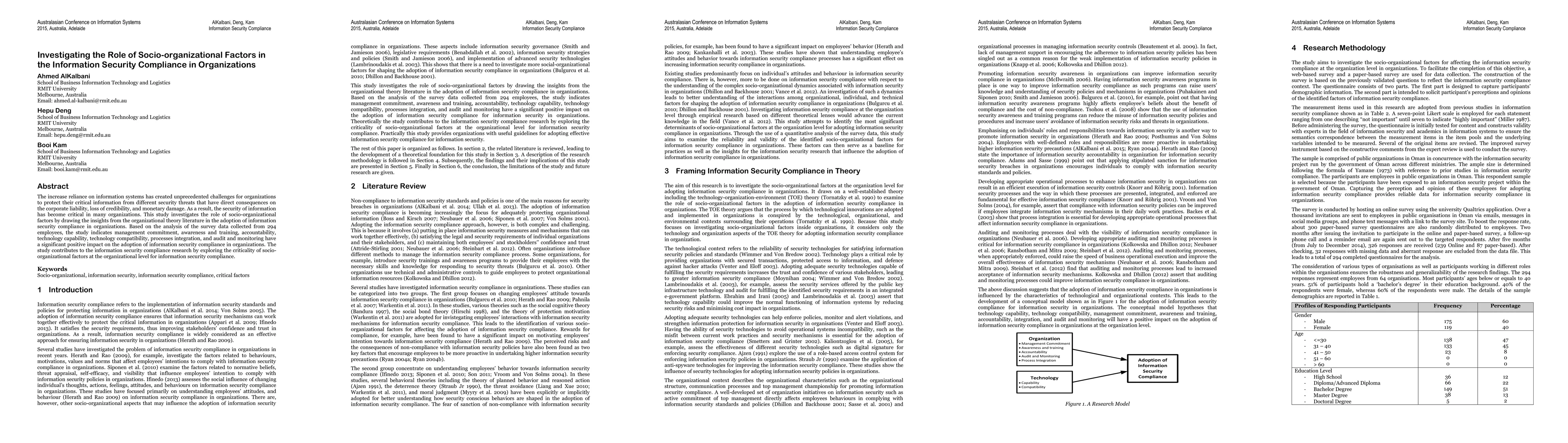 This study explores the influence of socio-organizational factors on information security compliance in organizations, finding that management commitment, training, accountability, and technology integration significantly enhance compliance. The research underscores the importance of these factors in addressing security challenges.
