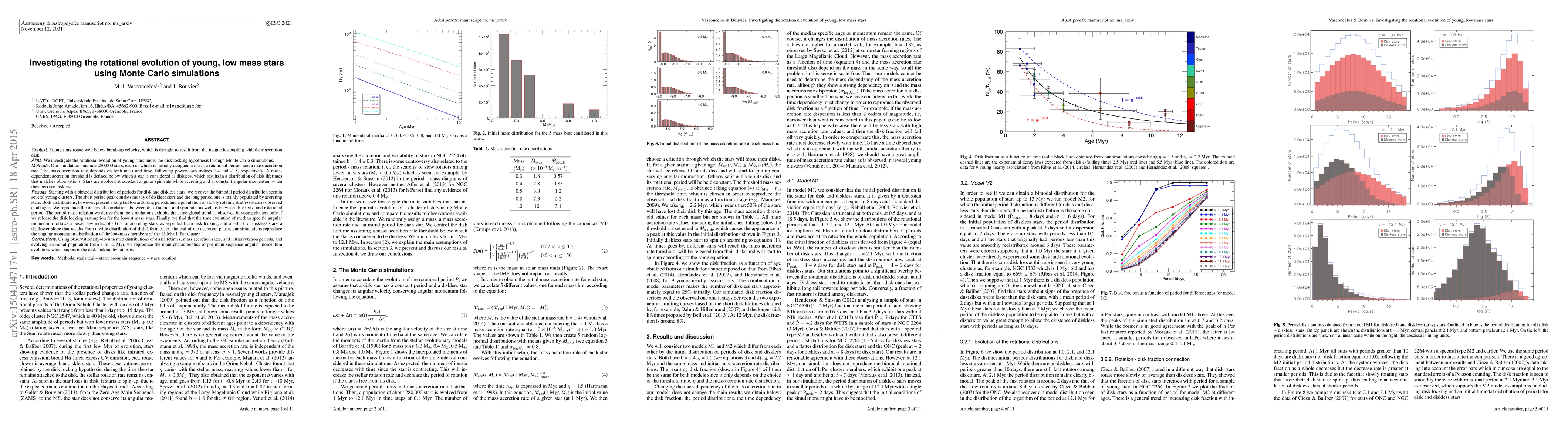 This paper uses Monte Carlo simulations to study the rotational evolution of young, low-mass stars, finding that the bimodal period distribution matches observations. The results support the disk locking hypothesis and reveal a wide distribution of disk lifetimes affecting angular momentum evolution.