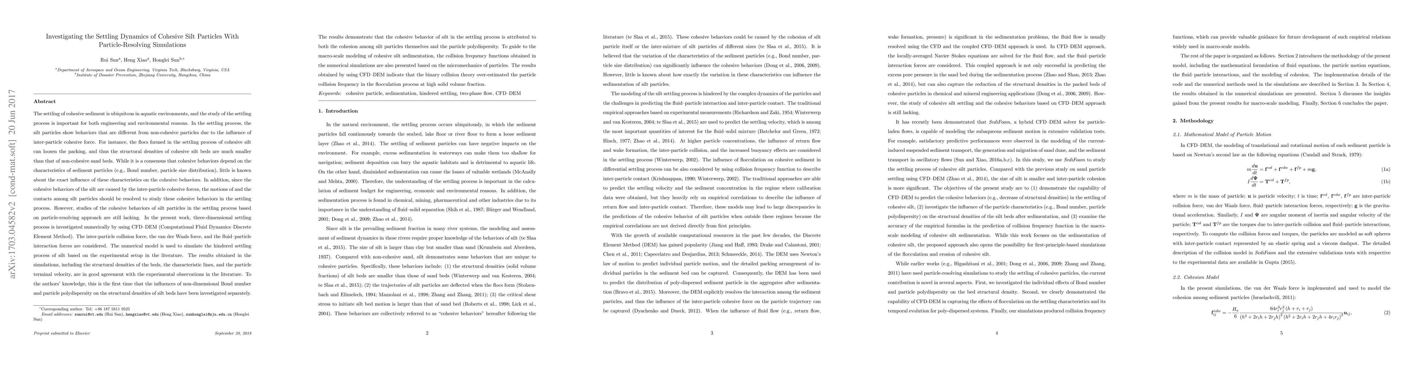 This study uses CFD-DEM simulations to investigate the settling dynamics of cohesive silt particles, revealing how inter-particle forces and particle size distribution influence settling behavior. The results show that both cohesion and polydispersity significantly affect silt settling, providing insights for macro-scale sedimentation modeling.