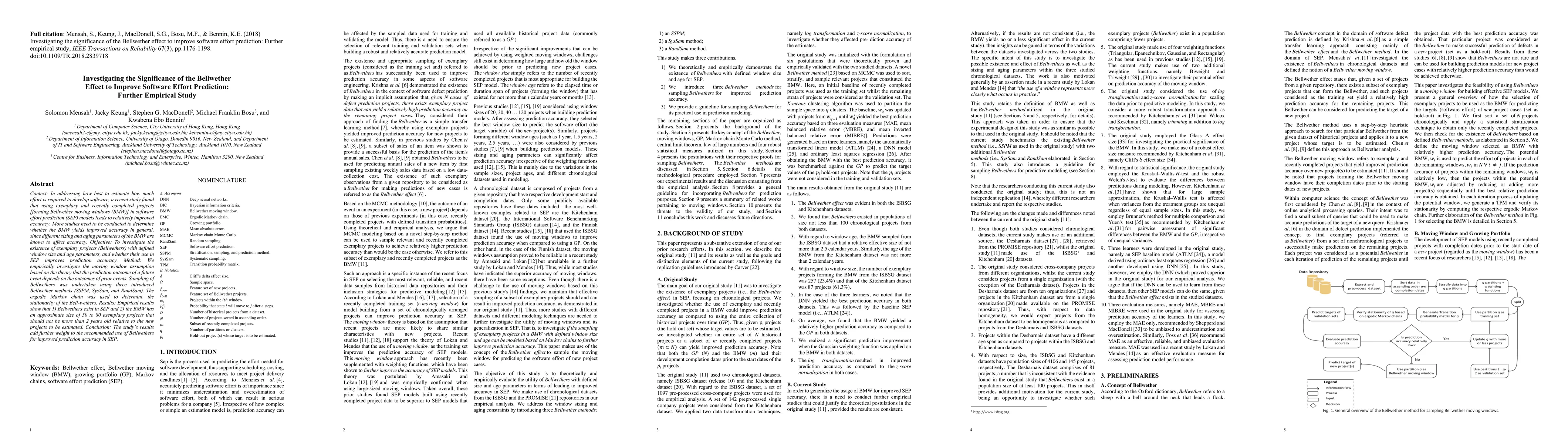 Context: In addressing how best to estimate how much effort is required to develop software, a recent study found that using exemplary and recently completed projects [forming Bellwether moving windows (BMW)] in software effort prediction (SEP) models leads to relatively improved accuracy. More studies need to be conducted to determine whether the BMW yields improved accuracy in general, since different sizing and aging parameters of the BMW are known to affect accuracy. Objective: To investigate the existence of exemplary projects (Bellwethers) with defined window size and age parameters, and whether their use in SEP improves prediction accuracy. Method: We empirically investigate the moving window assumption based on the theory that the prediction outcome of a future event depends on the outcomes of prior events. Sampling of Bellwethers was undertaken using three introduced Bellwether methods (SSPM, SysSam, and RandSam). The ergodic Markov chain was used to determine the stationarity of the Bell-wethers. Results: Empirical results show that 1) Bellwethers exist in SEP and 2) the BMW has an approximate size of 50 to 80 exemplary projects that should not be more than 2 years old relative to the new projects to be estimated. Conclusion: The study's results add further weight to the recommended use of Bellwethers for improved prediction accuracy in SEP.