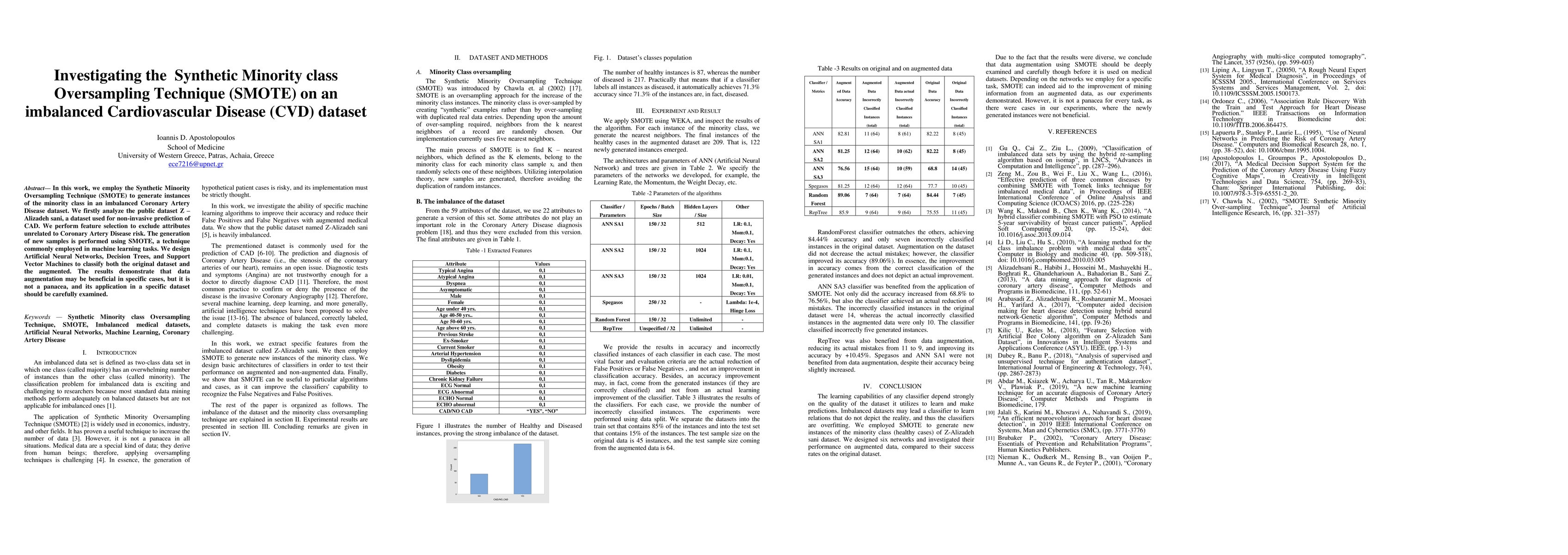 This study applies SMOTE to balance an imbalanced Coronary Artery Disease dataset, followed by feature selection and classification using ANN, Decision Trees, and SVM. Results show that while data augmentation can be beneficial, it should be carefully evaluated for each specific dataset.