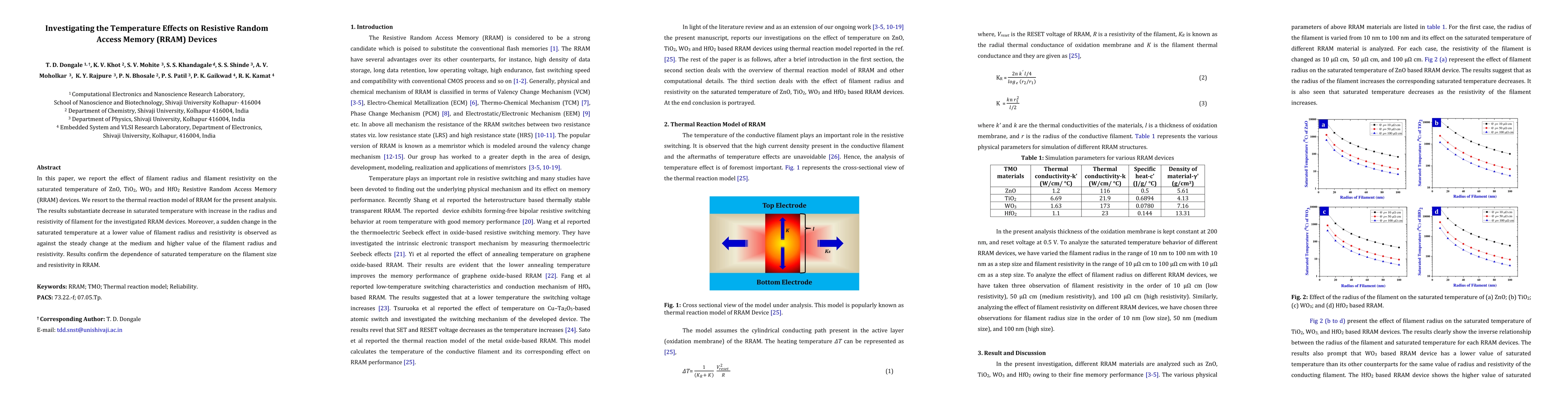 This paper investigates how filament radius and resistivity affect the saturated temperature in ZnO, TiO2, WO3, and HfO2 Resistive Random Access Memory devices using a thermal reaction model. Findings show that saturated temperature decreases with increasing filament radius and resistivity, with a notable sudden change at lower filament values.