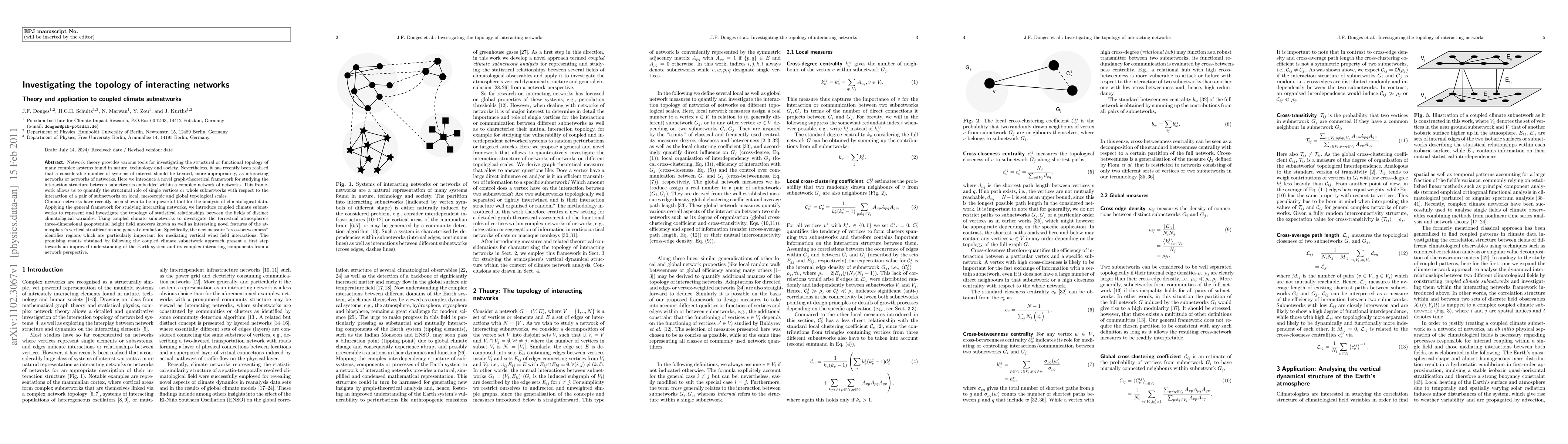 Network theory provides various tools for investigating the structural or functional topology of many complex systems found in nature, technology and society. Nevertheless, it has recently been realised that a considerable number of systems of interest should be treated, more appropriately, as interacting networks or networks of networks. Here we introduce a novel graph-theoretical framework for studying the interaction structure between subnetworks embedded within a complex network of networks. This framework allows us to quantify the structural role of single vertices or whole subnetworks with respect to the interaction of a pair of subnetworks on local, mesoscopic and global topological scales. Climate networks have recently been shown to be a powerful tool for the analysis of climatological data. Applying the general framework for studying interacting networks, we introduce coupled climate subnetworks to represent and investigate the topology of statistical relationships between the fields of distinct climatological variables. Using coupled climate subnetworks to investigate the terrestrial atmosphere's three-dimensional geopotential height field uncovers known as well as interesting novel features of the atmosphere's vertical stratification and general circulation. Specifically, the new measure "cross-betweenness" identifies regions which are particularly important for mediating vertical wind field interactions. The promising results obtained by following the coupled climate subnetwork approach present a first step towards an improved understanding of the Earth system and its complex interacting components from a network perspective.