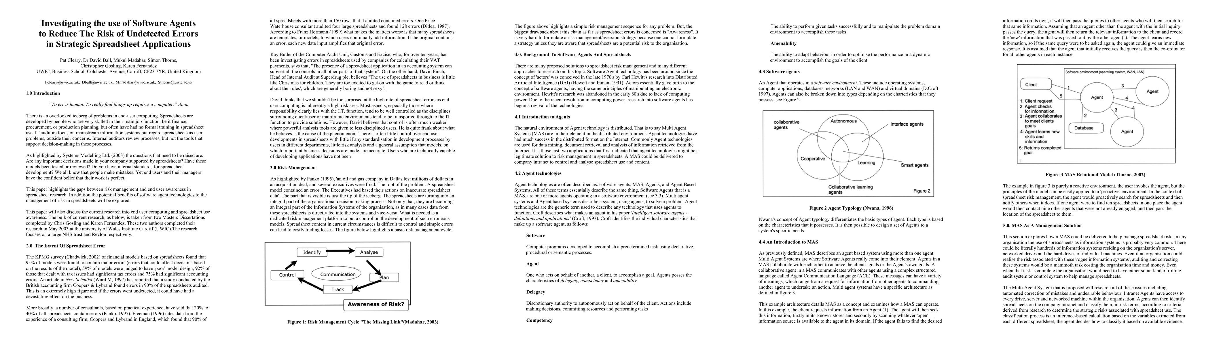 This paper investigates the risks of undetected errors in strategic spreadsheet applications, highlighting the lack of formal training among skilled end users and the oversight by IT auditors. It explores the potential of software agent technologies to mitigate these risks and improve risk management awareness in spreadsheet use.