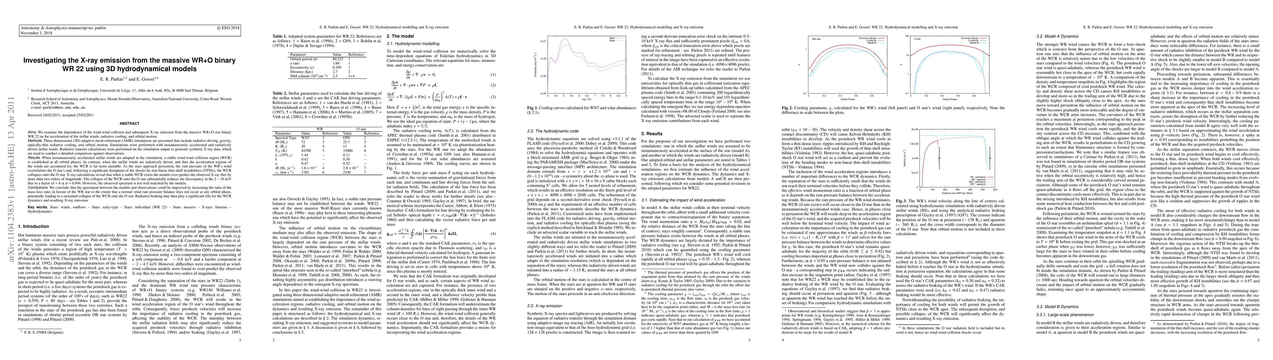 The study investigates the X-ray emission from the massive WR+O binary WR 22 using 3D hydrodynamical models. Key findings include that instantly accelerated winds create a stable wind-wind collision region (WCR), while radiatively driven winds cause instability, leading to WCR collapse onto the O star near periastron. Models overpredict observed X-ray flux significantly unless WCR collapse is considered, suggesting the need for enhanced WR mass-loss rates and potential significant role of radiative braking in WCR dynamics and X-ray emission.