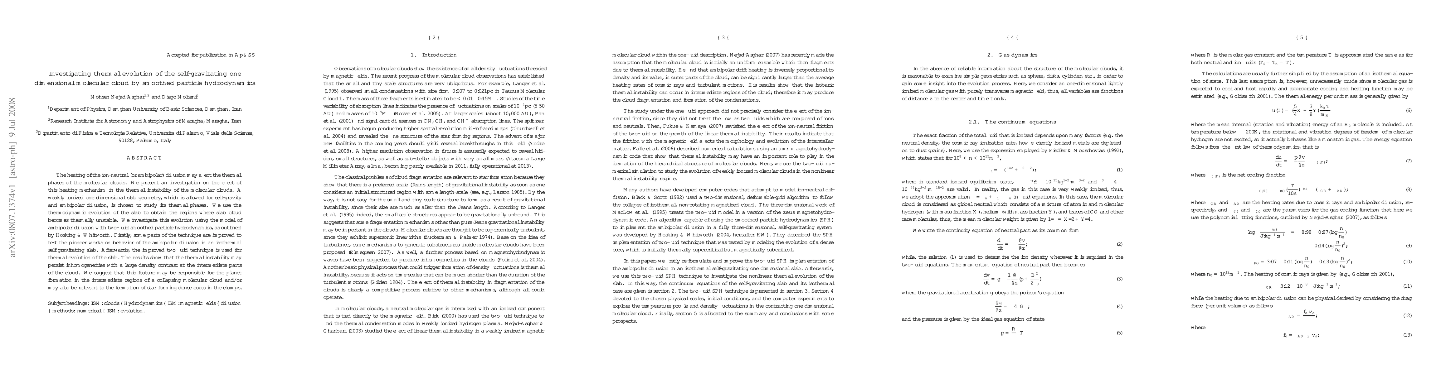 This paper investigates the thermal evolution of a self-gravitating one-dimensional molecular cloud using improved two-fluid smoothed particle hydrodynamics, focusing on the effects of ion-neutral ambipolar diffusion. The findings suggest that thermal instability can create inhomogeneities with large density contrasts, potentially influencing planet formation and the development of star-forming dense cores.