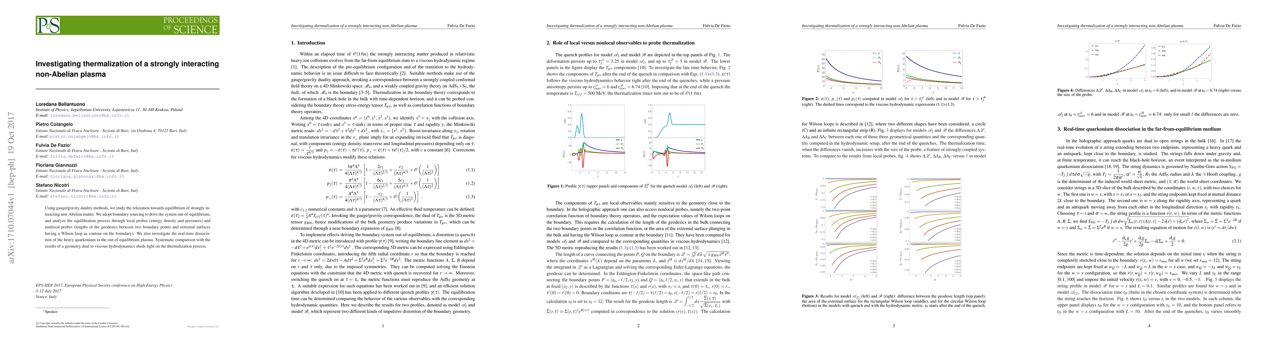Using gauge/gravity duality methods, we study the relaxation towards equilibrium of strongly interacting non-Abelian matter. We adopt boundary sourcing to drive the system out-of-equilibrium, and analyze the equilibration process through local probes (energy density and pressures) and nonlocal probes (lengths of the geodesics between two boundary points and extremal surfaces having a Wilson loop as contour on the boundary). We also investigate the real-time dissociation of the heavy quarkonium in the out-of-equilibrium plasma. Systematic comparison with the results of a geometry dual to viscous hydrodynamics sheds light on the thermalization process.