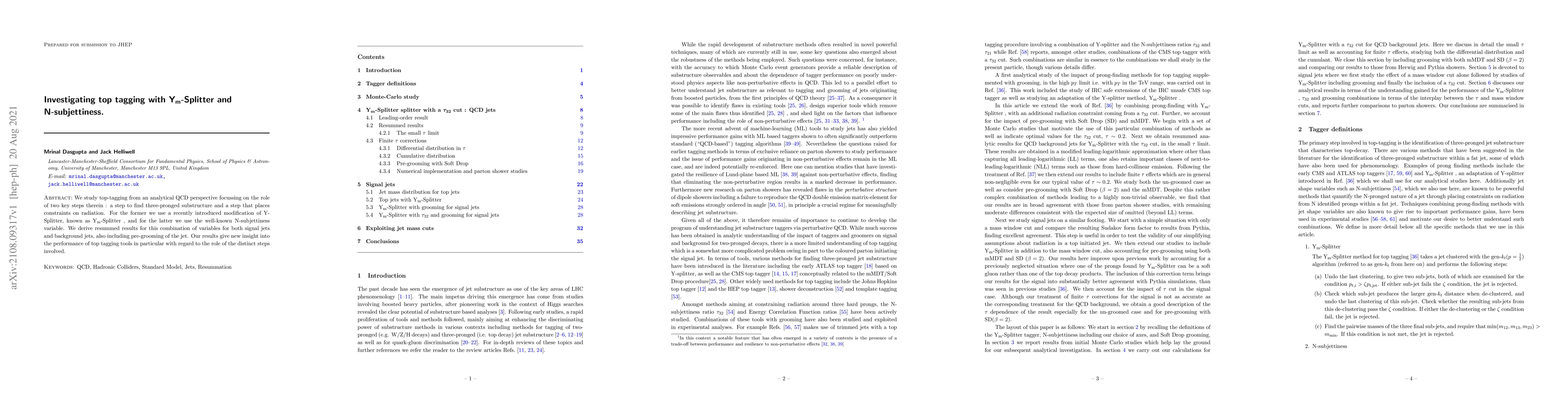 We study top-tagging from an analytical QCD perspective focusing on the role of two key steps therein : a step to find three-pronged substructure and a step that places constraints on radiation. For the former we use a recently introduced modification of Y-Splitter, known as Y$_{\text{m}}$-Splitter, and for the latter we use the well-known N-subjettiness variable. We derive resummed results for this combination of variables for both signal jets and background jets, also including pre-grooming of the jet. Our results give new insight into the performance of top tagging tools in particular with regard to the role of the distinct steps involved.