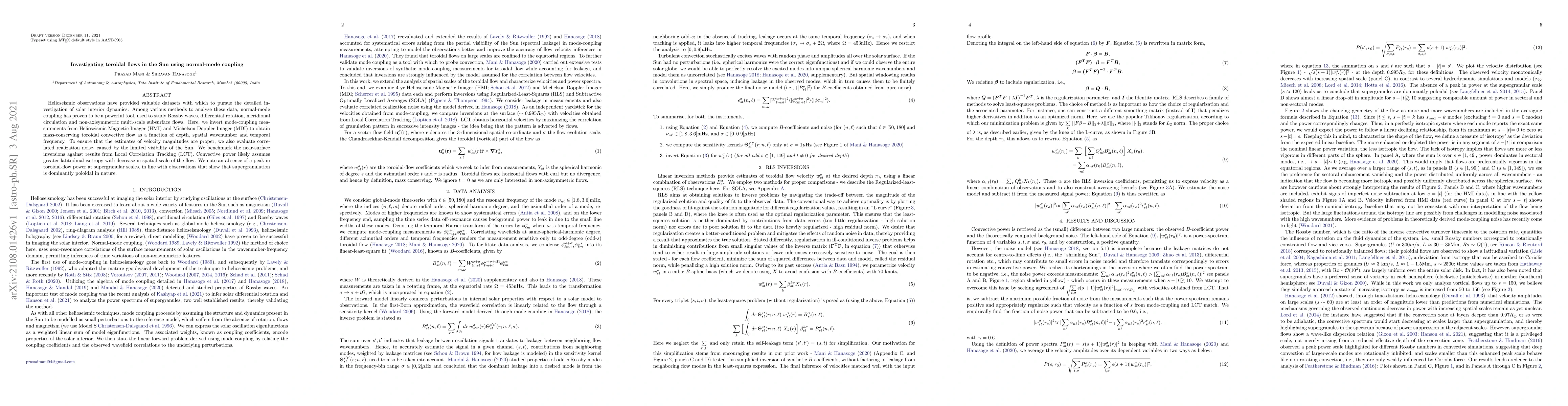 This paper investigates toroidal flows in the Sun's interior using normal-mode coupling techniques, analyzing data from HMI and MDI to determine the convective flow's characteristics. The study finds that convective power exhibits greater latitudinal isotropy at smaller scales, and notes the absence of a toroidal flow peak at supergranular scales, supporting the idea that supergranulation is primarily poloidal.