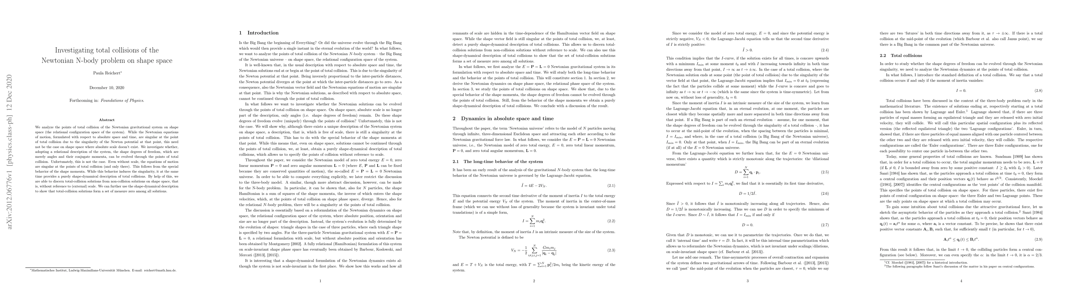 We analyze the points of total collision of the Newtonian gravitational system on shape space (the relational configuration space of the system). While the Newtonian equations of motion, formulated with respect to absolute space and time, are singular at the point of total collision due to the singularity of the Newton potential at that point, this need not be the case on shape space where absolute scale doesn't exist. We investigate whether, adopting a relational description of the system, the shape degrees of freedom, which are merely angles and their conjugate momenta, can be evolved through the points of total collision. Unfortunately, this is not the case. Even without scale, the equations of motion are singular at the points of total collision (and only there). This follows from the special behavior of the shape momenta. While this behavior induces the singularity, it at the same time provides a purely shape-dynamical description of total collisions. By help of this, we are able to discern total-collision solutions from non-collision solutions on shape space, that is, without reference to (external) scale. We can further use the shape-dynamical description to show that total-collision solutions form a set of measure zero among all solutions.