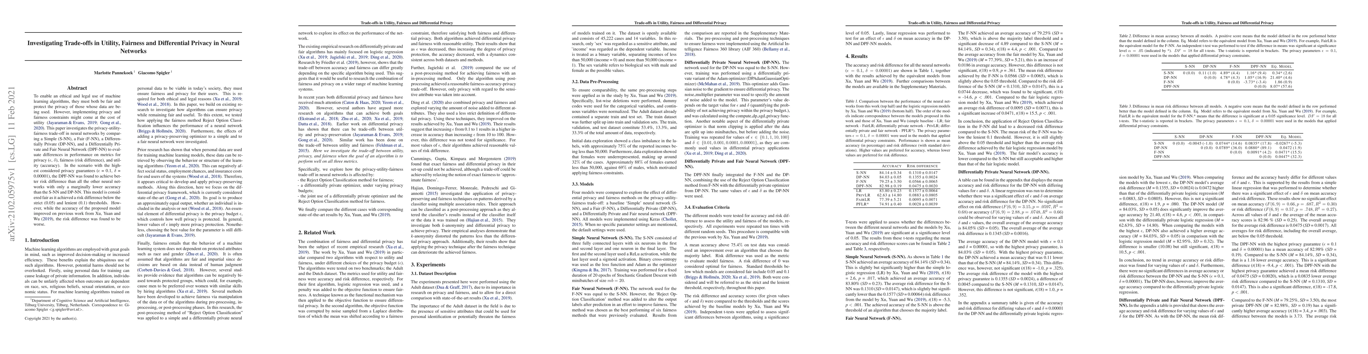 This paper examines the trade-off between privacy, fairness, and utility in neural networks, comparing Simple, Fair, Differentially Private, and Differentially Private and Fair models. The Differentially Private and Fair Neural Network (DPF-NN) achieved better fairness with only a slight drop in accuracy, though the risk difference was worse compared to previous studies.