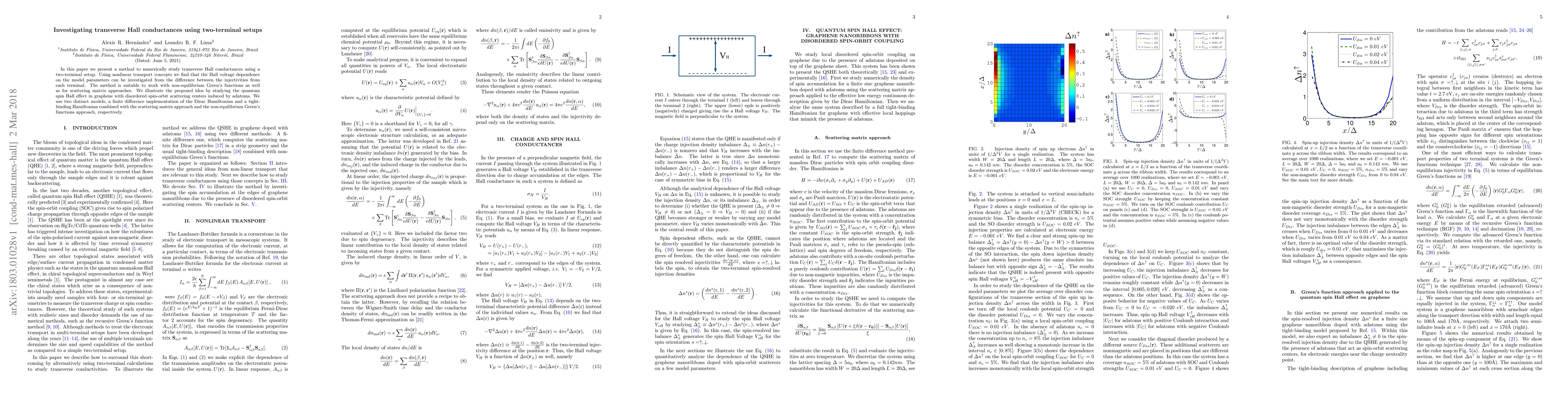 In this paper we present a method to numerically study transverse Hall conductances using a two-terminal setup. Using nonlinear transport concepts we find that the Hall voltage dependence on the model parameters can be investigated from the difference between the injectivities from each terminal. The method is suitable to work with non-equilibrium Green's functions as well as for scattering matrix approaches. We illustrate the proposed idea by studying the quantum spin Hall effect in graphene with disordered spin-orbit scattering centers induced by adatoms. We use two distinct models, a finite difference implementation of the Dirac Hamiltonian and a tight-binding Hamiltonian combined with the scattering matrix approach and the non-equilibrium Green's functions approach, respectively.