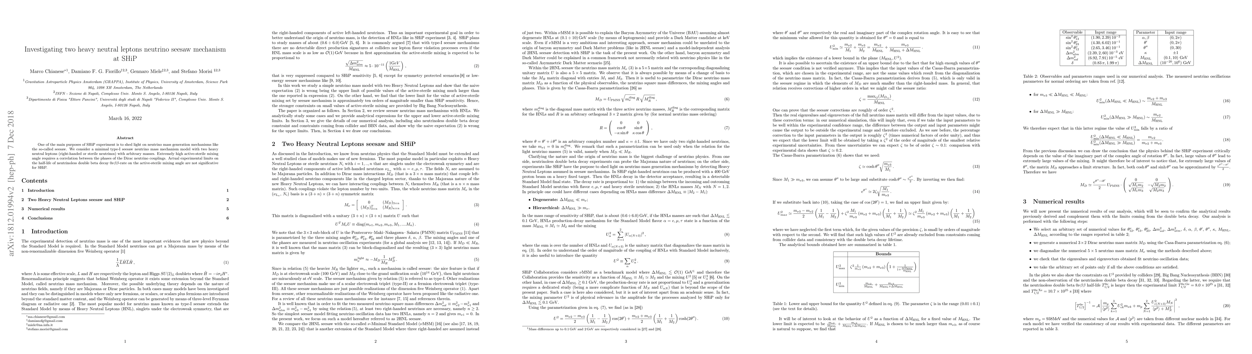 Summary: The SHiP experiment investigates a minimal type-I seesaw model featuring two heavy neutral leptons, exploring their role in neutrino mass generation. The study finds that high active-sterile mixing angles necessitate a correlation between the phases of Dirac neutrino couplings, though current experimental limits on neutrinoless double beta decay do not significantly constrain SHiP's findings.