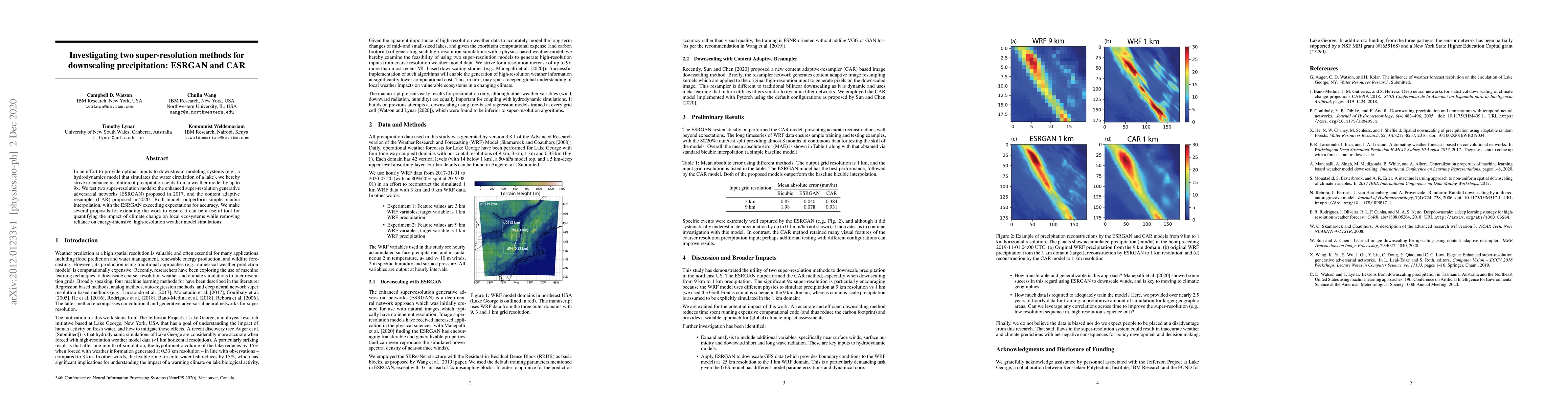 In an effort to provide optimal inputs to downstream modeling systems (e.g., a hydrodynamics model that simulates the water circulation of a lake), we hereby strive to enhance resolution of precipitation fields from a weather model by up to 9x. We test two super-resolution models: the enhanced super-resolution generative adversarial networks (ESRGAN) proposed in 2017, and the content adaptive resampler (CAR) proposed in 2020. Both models outperform simple bicubic interpolation, with the ESRGAN exceeding expectations for accuracy. We make several proposals for extending the work to ensure it can be a useful tool for quantifying the impact of climate change on local ecosystems while removing reliance on energy-intensive, high-resolution weather model simulations.