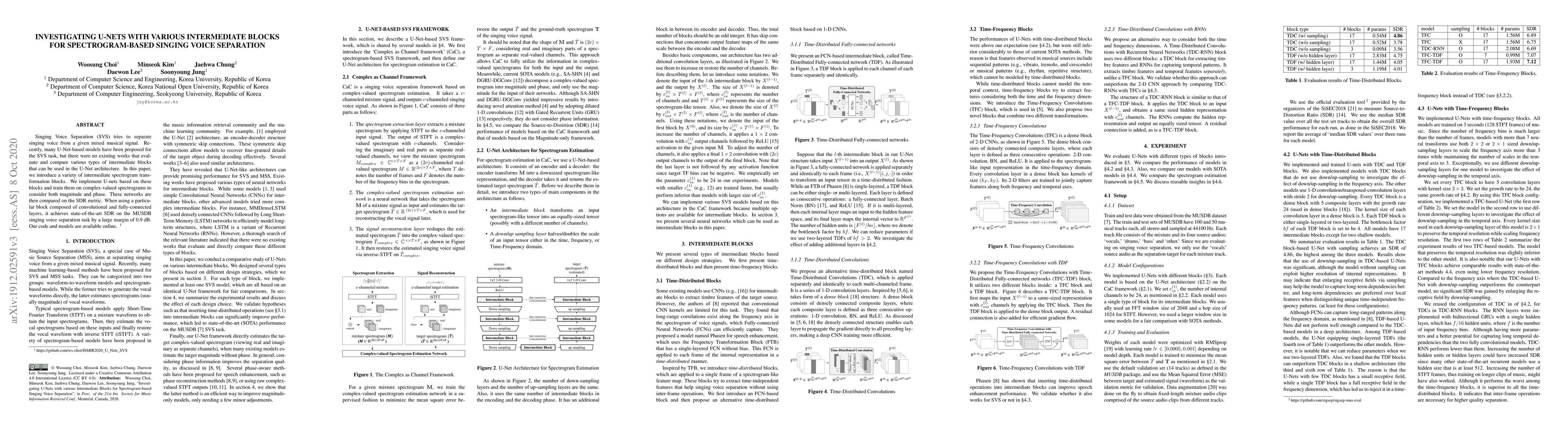 Singing Voice Separation (SVS) tries to separate singing voice from a given mixed musical signal. Recently, many U-Net-based models have been proposed for the SVS task, but there were no existing works that evaluate and compare various types of intermediate blocks that can be used in the U-Net architecture. In this paper, we introduce a variety of intermediate spectrogram transformation blocks. We implement U-nets based on these blocks and train them on complex-valued spectrograms to consider both magnitude and phase. These networks are then compared on the SDR metric. When using a particular block composed of convolutional and fully-connected layers, it achieves state-of-the-art SDR on the MUSDB singing voice separation task by a large margin of 0.9 dB. Our code and models are available online.
