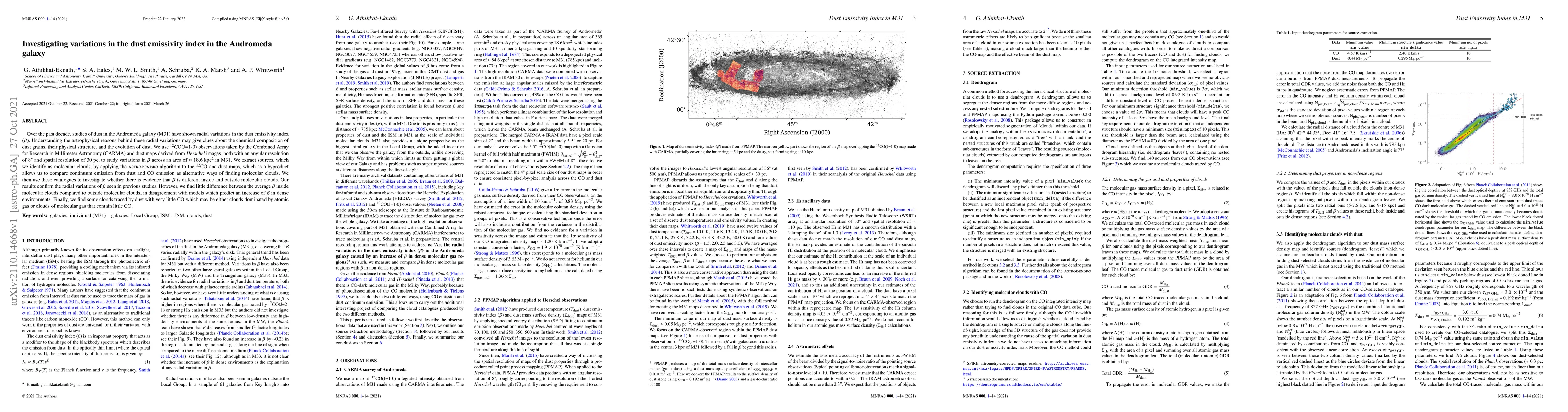 This study investigates radial variations in the dust emissivity index ($\beta$) in the Andromeda galaxy using $^{12}$CO observations and dust maps from CARMA and Herschel. The research finds consistent radial variations in $\beta$ but observes little difference in $\beta$ inside versus outside molecular clouds, contrary to model predictions.