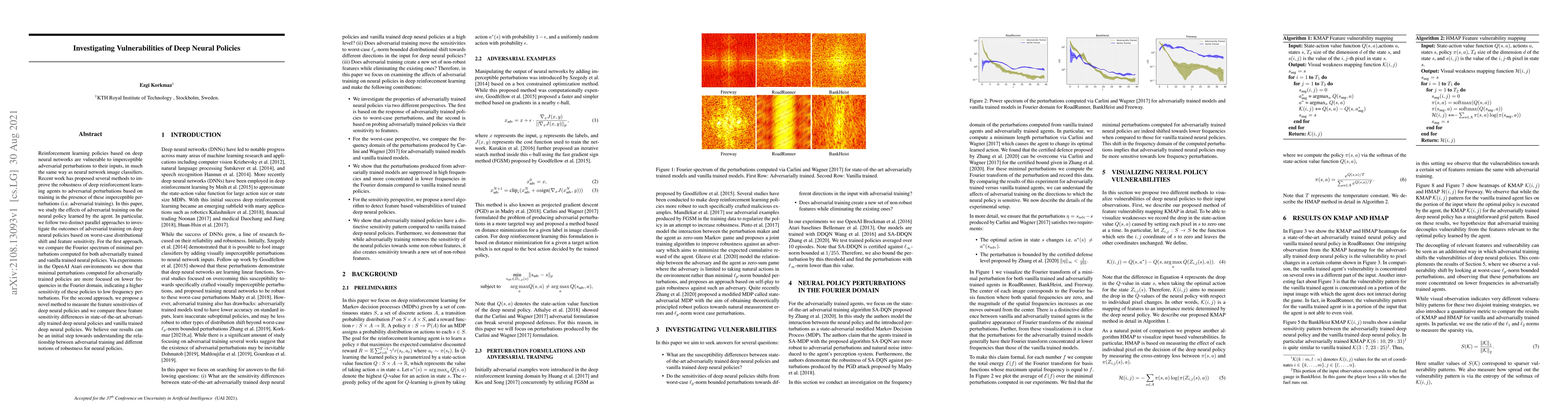 This paper investigates the vulnerabilities of deep neural policies in reinforcement learning to adversarial perturbations, exploring the effects of adversarial training through worst-case distributional shift and feature sensitivity. Experiments show adversarially trained policies are more sensitive to low-frequency perturbations and have different feature sensitivities compared to vanilla trained policies.
