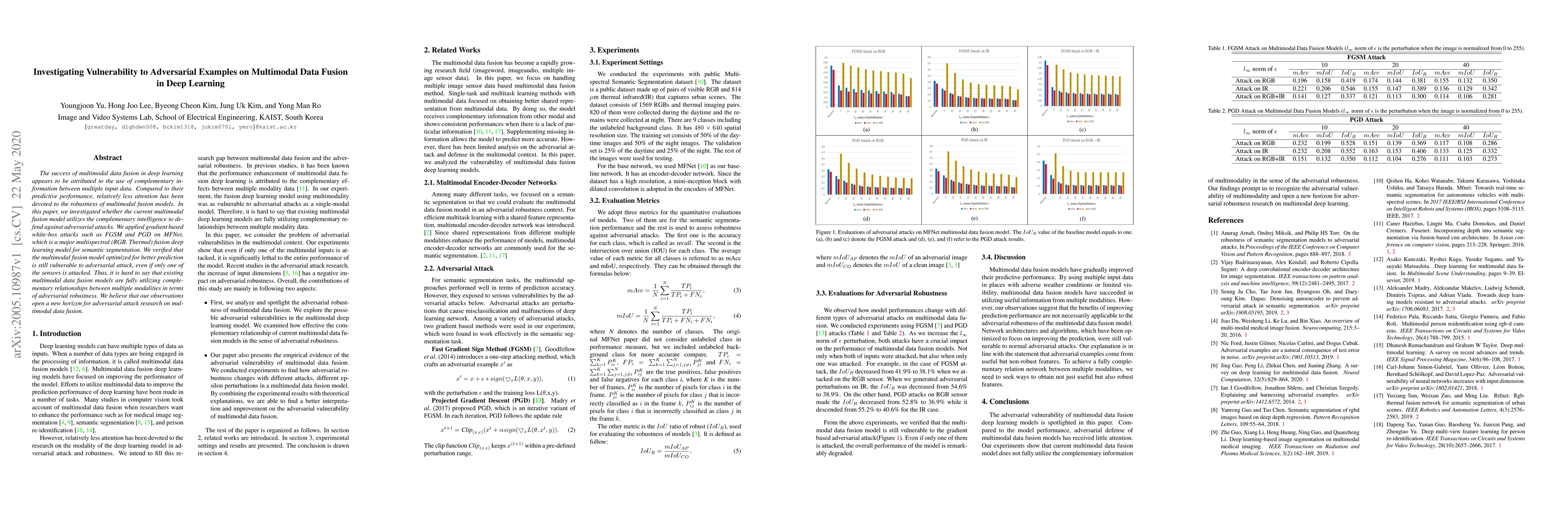 The success of multimodal data fusion in deep learning appears to be attributed to the use of complementary in-formation between multiple input data. Compared to their predictive performance, relatively less attention has been devoted to the robustness of multimodal fusion models. In this paper, we investigated whether the current multimodal fusion model utilizes the complementary intelligence to defend against adversarial attacks. We applied gradient based white-box attacks such as FGSM and PGD on MFNet, which is a major multispectral (RGB, Thermal) fusion deep learning model for semantic segmentation. We verified that the multimodal fusion model optimized for better prediction is still vulnerable to adversarial attack, even if only one of the sensors is attacked. Thus, it is hard to say that existing multimodal data fusion models are fully utilizing complementary relationships between multiple modalities in terms of adversarial robustness. We believe that our observations open a new horizon for adversarial attack research on multimodal data fusion.
