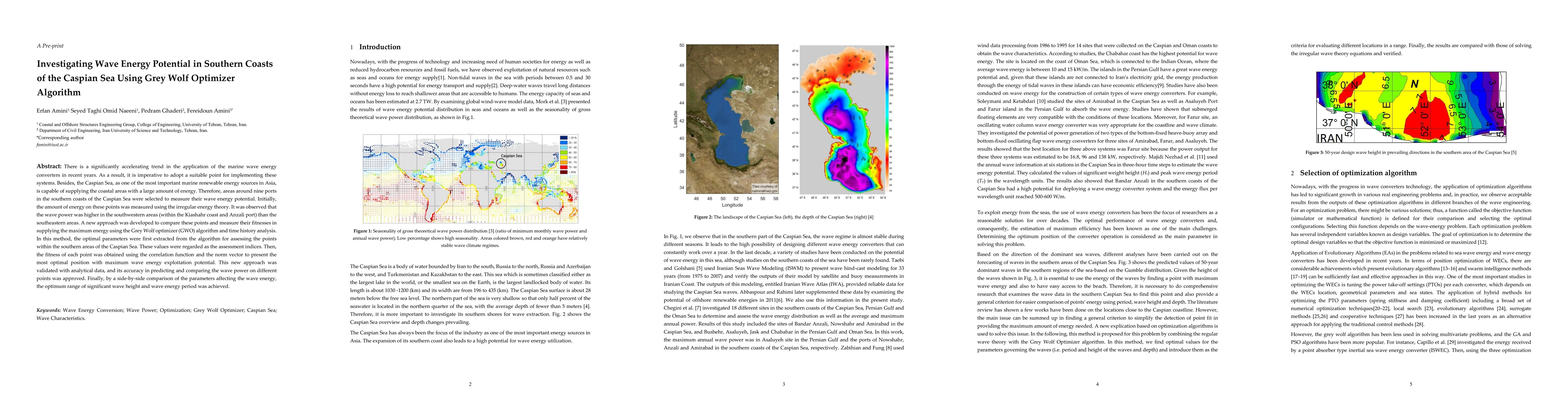 This paper investigates the wave energy potential along the southern coasts of the Caspian Sea using the Grey Wolf Optimizer (GWO) algorithm. The study found that the southwestern areas, particularly around Kiashahr coast and Anzali port, have higher wave power potential, and the GWO-based approach accurately identified the optimal wave energy exploitation sites.