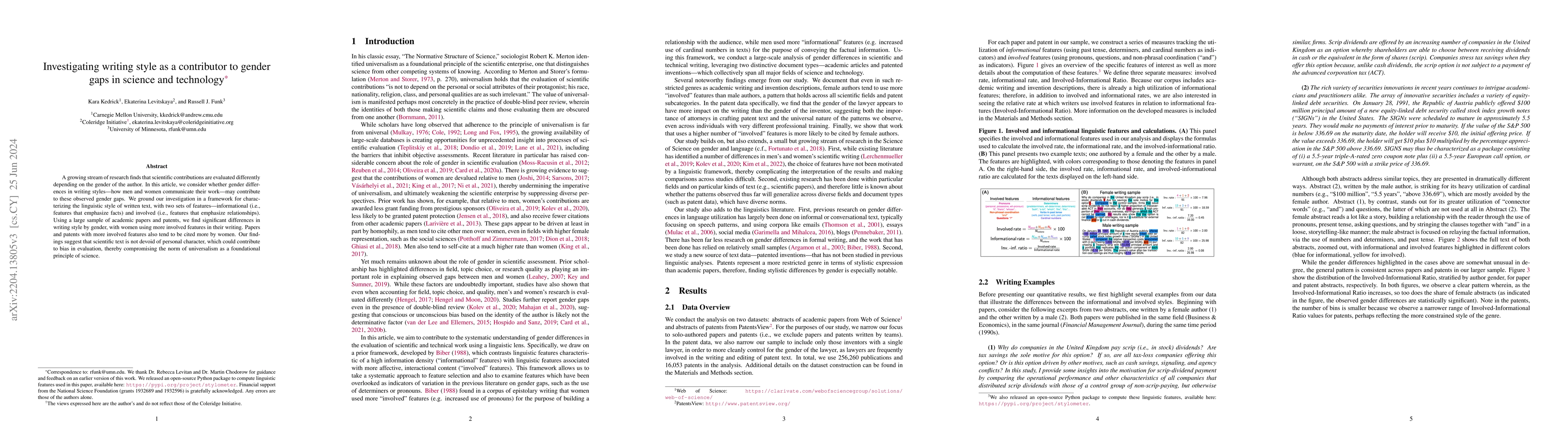 This research investigates whether gender differences in writing styles contribute to gender gaps in science and technology. It finds significant differences in writing styles, with women using more involved features, which may lead to biased evaluations and compromise the principle of universalism in science.