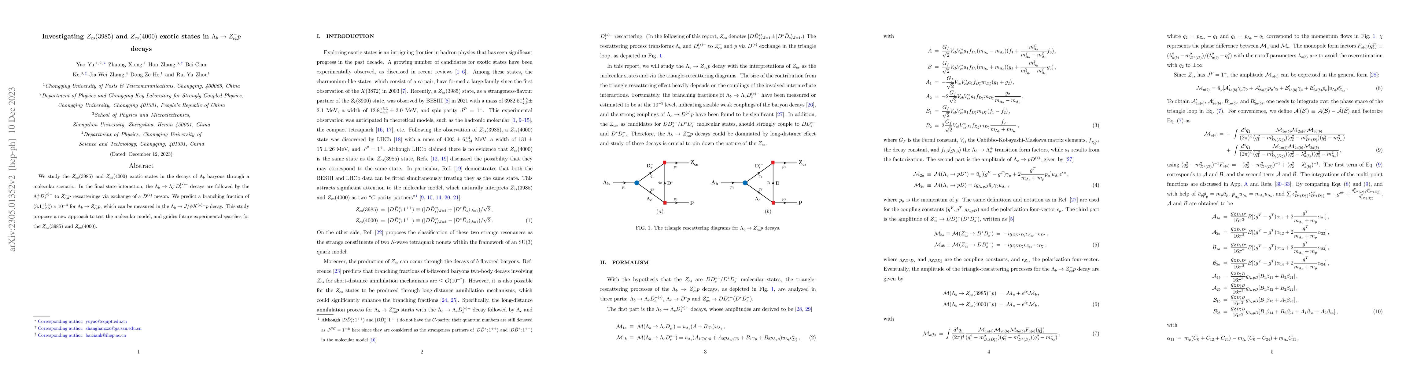 This study investigates the exotic $Z_{cs}(3985)$ and $Z_{cs}(4000)$ states in $\Lambda_b$ baryon decays through a molecular scenario, predicting a branching fraction for $\Lambda_b\to Z^-_{cs}p$ and suggesting it can be measured in $\Lambda_b\to J/\psi K^{(*)-}p$ decays. This approach tests the molecular model and guides future searches for these states.