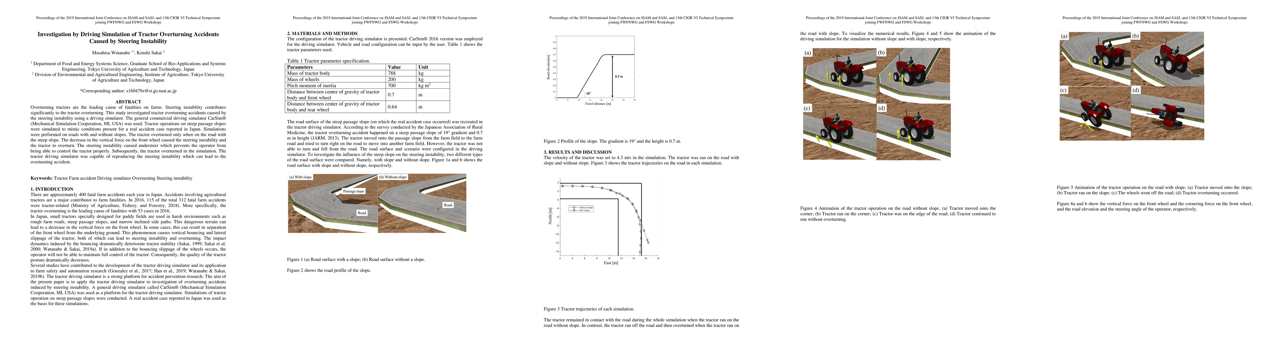 Overturning tractors are the leading cause of fatalities on farms. Steering instability contributes significantly to the tractor overturning. This study investigated tractor overturning accidents caused by the steering instability using a driving simulator. The general commercial driving simulator CarSim (Mechanical Simulation Cooperation, MI, USA) was used. Tractor operations on steep passage slopes were simulated to mimic conditions present for a real accident case reported in Japan. Simulations were performed on roads with and without slopes. The tractor overturned only when on the road with the steep slope. The decrease in the vertical force on the front wheel caused the steering instability and the tractor to overturn. The steering instability caused understeer which prevents the operator from being able to control the tractor properly. Subsequently, the tractor overturned in the simulation. The tractor driving simulator was capable of reproducing the steering instability which can lead to the overturning accident.