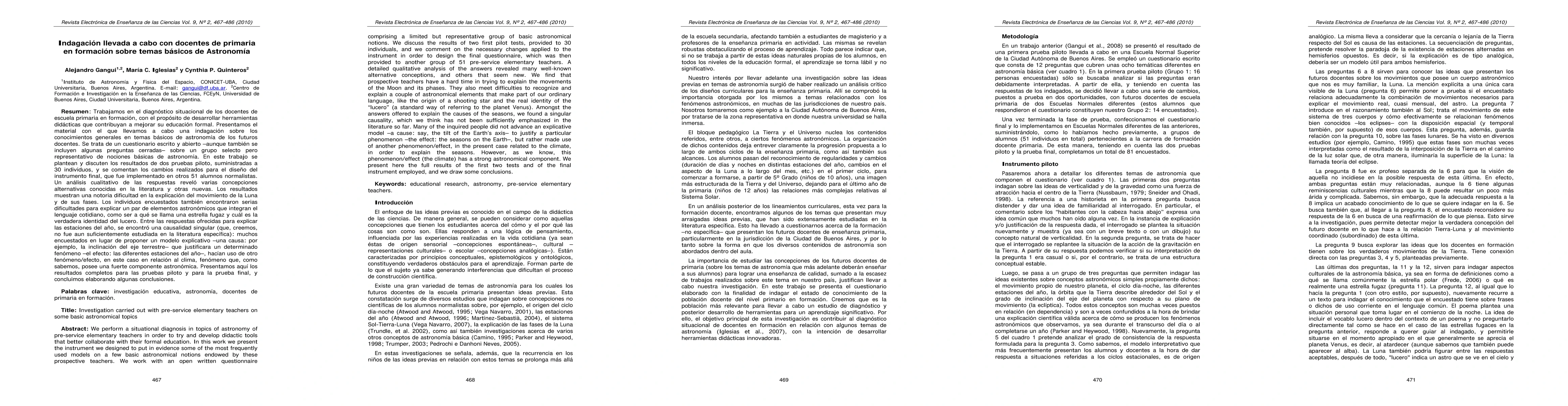 This study diagnoses pre-service elementary teachers' understanding of basic astronomy, revealing common misconceptions, particularly regarding lunar phases and the causes of seasons. The research developed a questionnaire to identify these issues, leading to revisions and further testing with a larger group, ultimately highlighting the need for improved didactic tools in astronomy education.