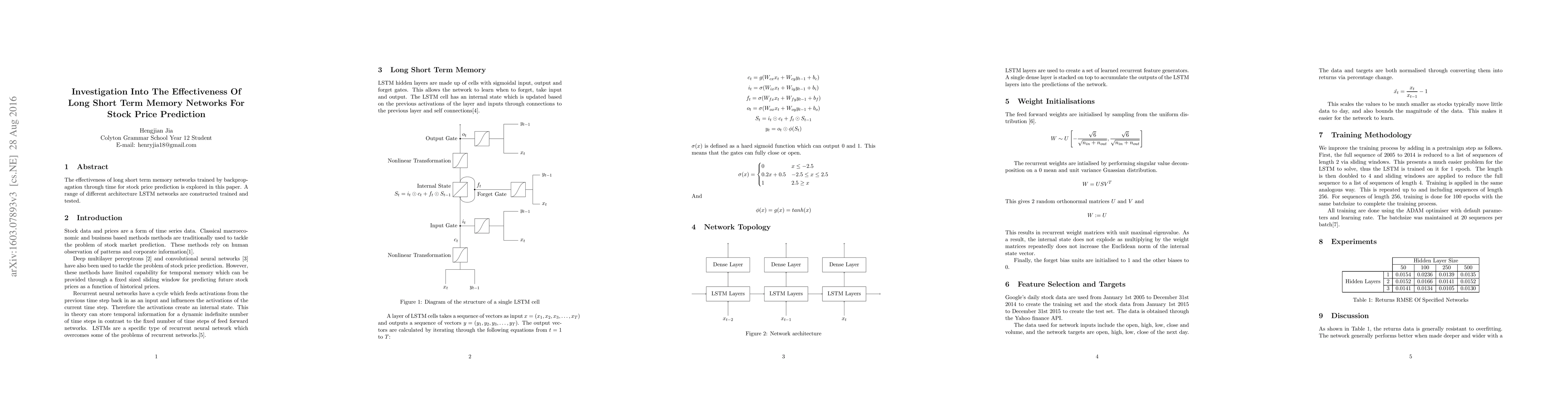 Summary: This paper investigates the efficacy of various long short term memory (LSTM) networks trained via backpropagation through time for predicting stock prices, evaluating different architectures to determine the most effective model for this task.
