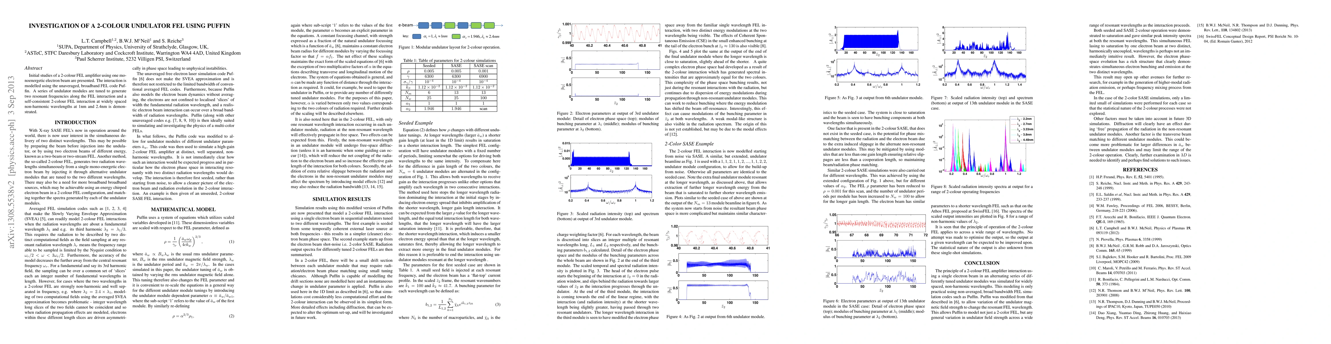 Researchers successfully demonstrated a 2-color FEL interaction using Puffin code, achieving self-consistent amplification at non-harmonic wavelengths of 1nm and 2.4nm.