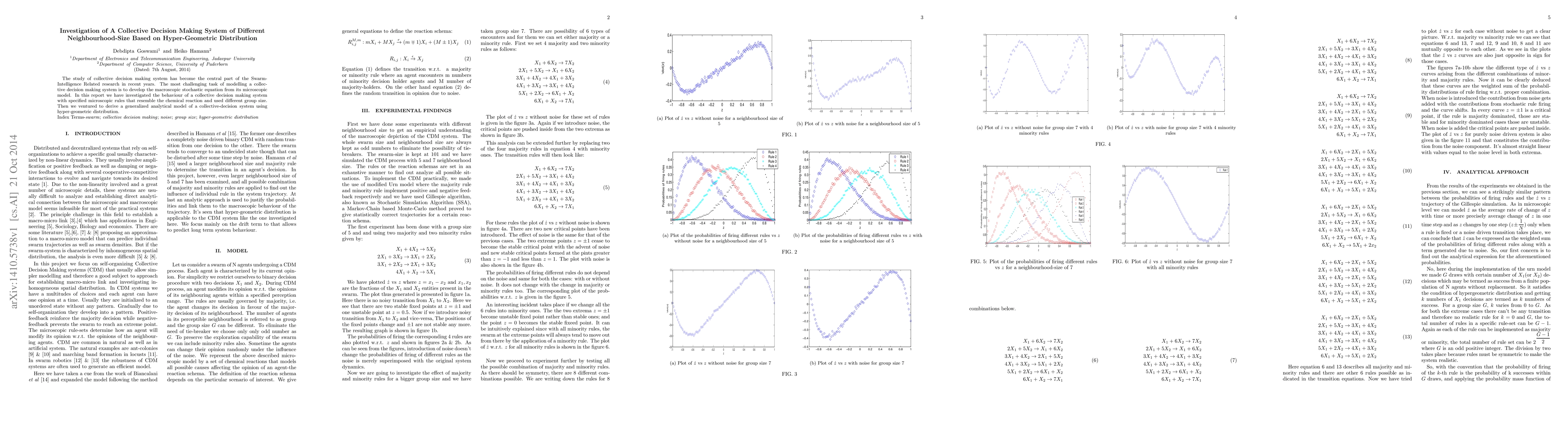 The study of collective decision making system has become the central part of the Swarm- Intelligence Related research in recent years. The most challenging task of modelling a collec- tive decision making system is to develop the macroscopic stochastic equation from its microscopic model. In this report we have investigated the behaviour of a collective decision making system with specified microscopic rules that resemble the chemical reaction and used different group size. Then we ventured to derive a generalized analytical model of a collective-decision system using hyper-geometric distribution. Index Terms-swarm; collective decision making; noise; group size; hyper-geometric distribution