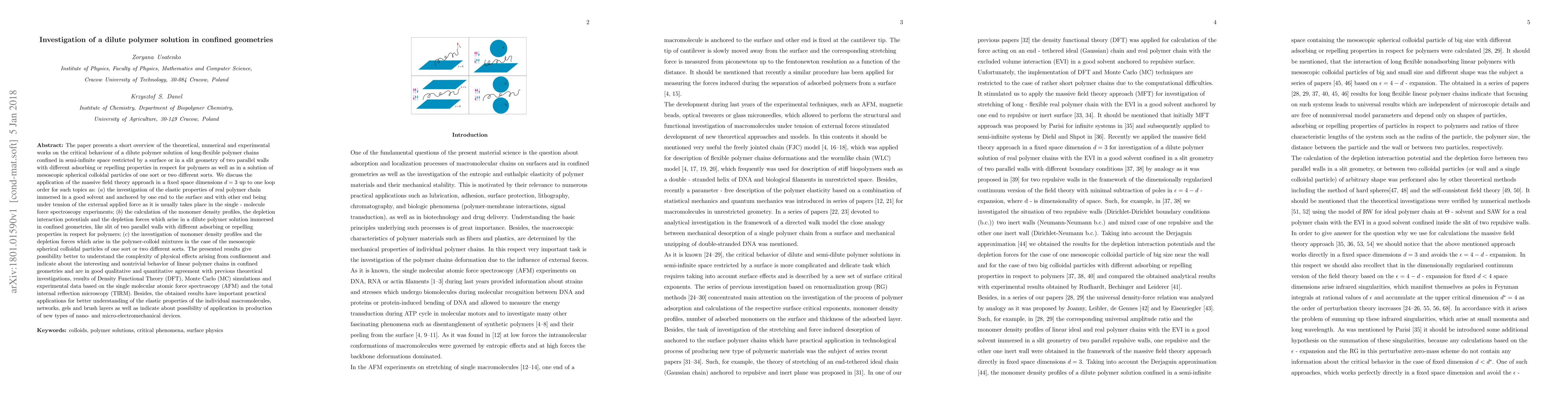 The paper presents a short overview of the theoretical, numerical and experimental works on the critical behavior of a dilute polymer solution of long-flexible polymer chains confined in semi-infinite space restricted by a surface or in a slit geometry of two parallel walls with different adsorbing or repelling properties in respect for polymers as well as in a solution of mesoscopic spherical colloidal particles of one sort or two different sorts. We discuss the application of the massive field theory approach in a fixed space dimensions d=3 up to one loop order for such topics as:(a) the investigation of the elastic properties of real polymer chain immersed in a good solvent and anchored by one end to the surface and with other end being under tension of the external applied force;(b) the calculation of the monomer density profiles, the depletion interaction potentials and the depletion forces which arise in a dilute polymer solution immersed in confined geometries, like slit of two parallel walls with different adsorbing or repelling properties in respect for polymers or in the polymer-colloid mixtures with mesoscopic spherical colloidal particles of one sort or two different sorts. The presented results give possibility better to understand the complexity of physical effects arising from confinement and indicate about the interesting and nontrivial behavior of linear polymer chains in confined geometries and are in good qualitative and quantitative agreement with previous theoretical investigations, results of DFT, MC simulations and experimental data based on the AFM and TIRM. Besides, the obtained results have important practical applications for better understanding of the elastic properties of the individual macromolecules, networks, gels and brush layers as well as indicate about possibility of application in production of new types of nano- and micro-electromechanical devices.