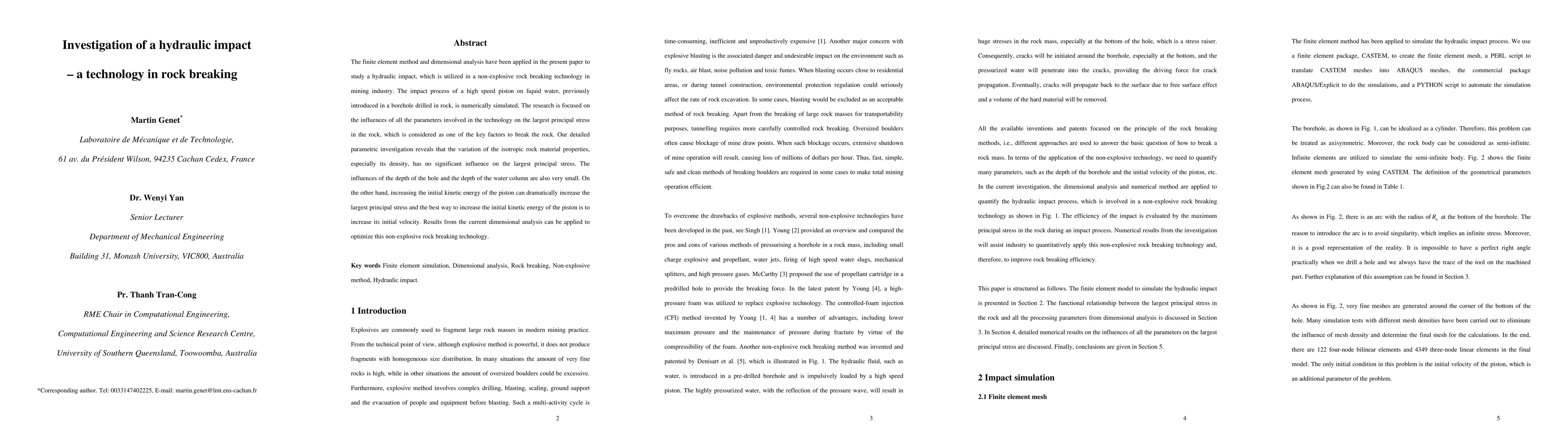 The paper presents a detailed parametric investigation of a hydraulic impact technology using finite element analysis and dimensional analysis, identifying the most influential parameters for rock breaking.