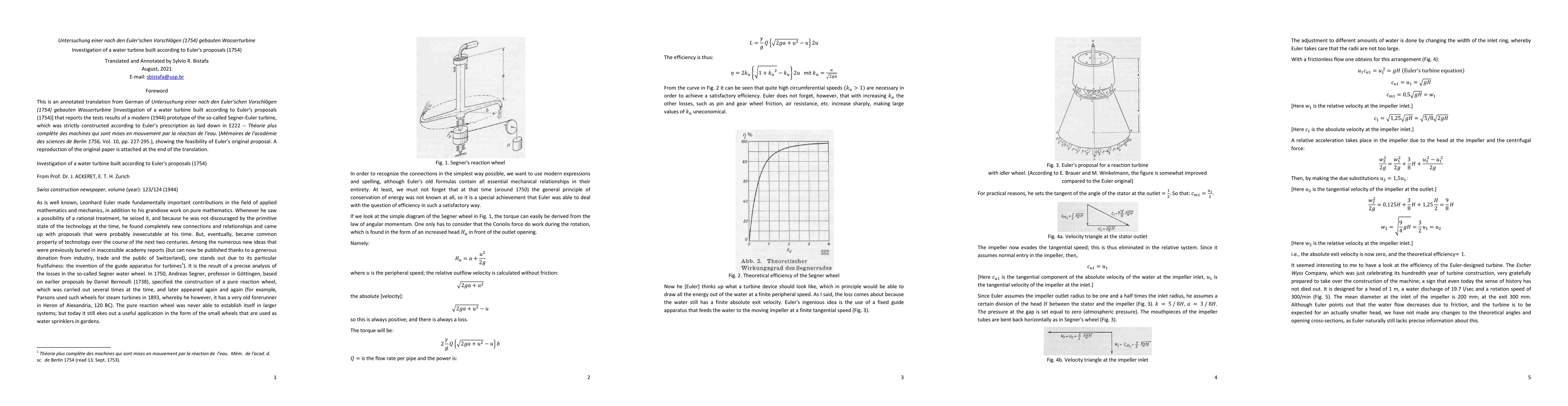 This paper presents test results from a 1944 prototype of a Segner-Euler water turbine built according to Euler's 1754 design, demonstrating the feasibility of his original proposal. The study includes an annotated translation of a historical German paper detailing the construction and testing of the turbine.