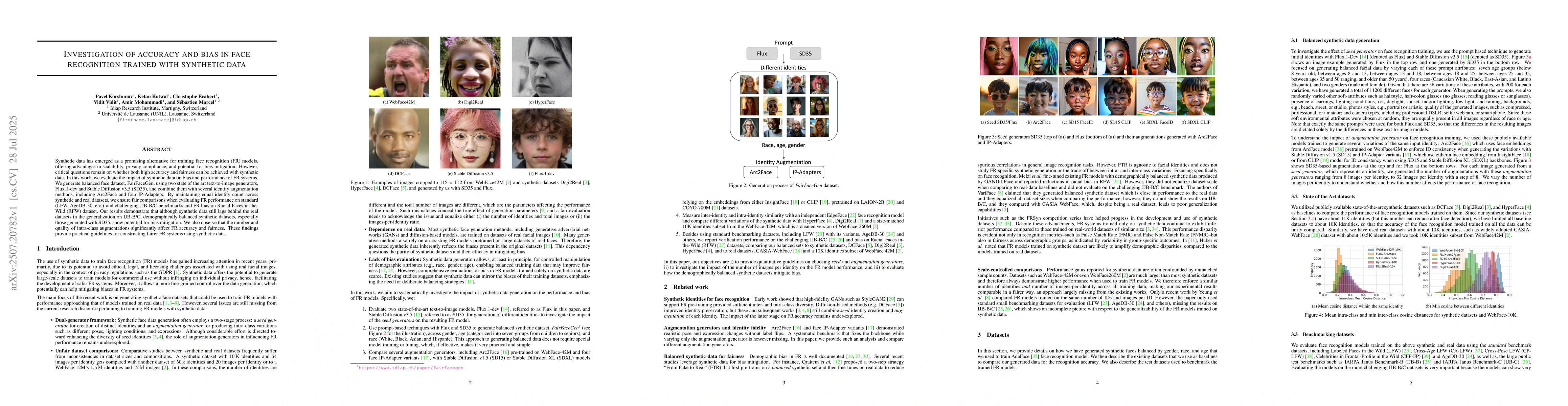 Synthetic data has emerged as a promising alternative for training face recognition (FR) models, offering advantages in scalability, privacy compliance, and potential for bias mitigation. However, critical questions remain on whether both high accuracy and fairness can be achieved with synthetic data. In this work, we evaluate the impact of synthetic data on bias and performance of FR systems. We generate balanced face dataset, FairFaceGen, using two state of the art text-to-image generators, Flux.1-dev and Stable Diffusion v3.5 (SD35), and combine them with several identity augmentation methods, including Arc2Face and four IP-Adapters. By maintaining equal identity count across synthetic and real datasets, we ensure fair comparisons when evaluating FR performance on standard (LFW, AgeDB-30, etc.) and challenging IJB-B/C benchmarks and FR bias on Racial Faces in-the-Wild (RFW) dataset. Our results demonstrate that although synthetic data still lags behind the real datasets in the generalization on IJB-B/C, demographically balanced synthetic datasets, especially those generated with SD35, show potential for bias mitigation. We also observe that the number and quality of intra-class augmentations significantly affect FR accuracy and fairness. These findings provide practical guidelines for constructing fairer FR systems using synthetic data.