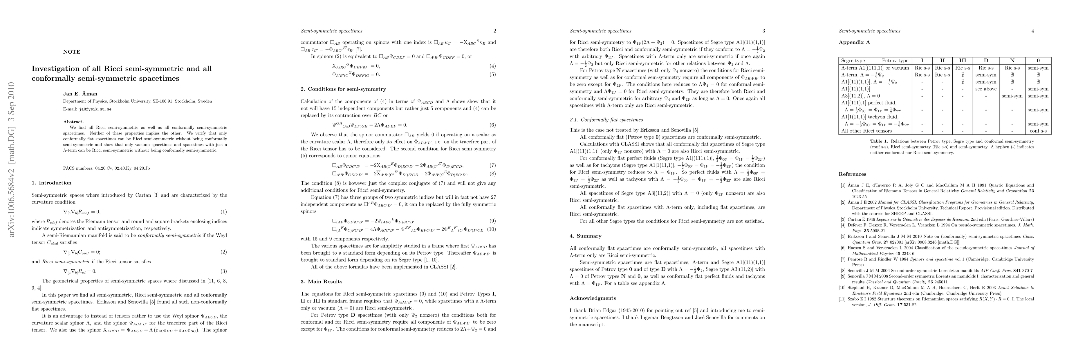 We find all Ricci semi-symmetric as well as all conformally semi-symmetric spacetimes. Neither of these properties implies the other. We verify that only conformally flat spacetimes can be Ricci semi-symmetric without being conformally semi-symmetric and show that only vacuum spacetimes and spacetimes with just a $\Lambda$-term can be Ricci semi-symmetric without being conformally semi-symmetric.