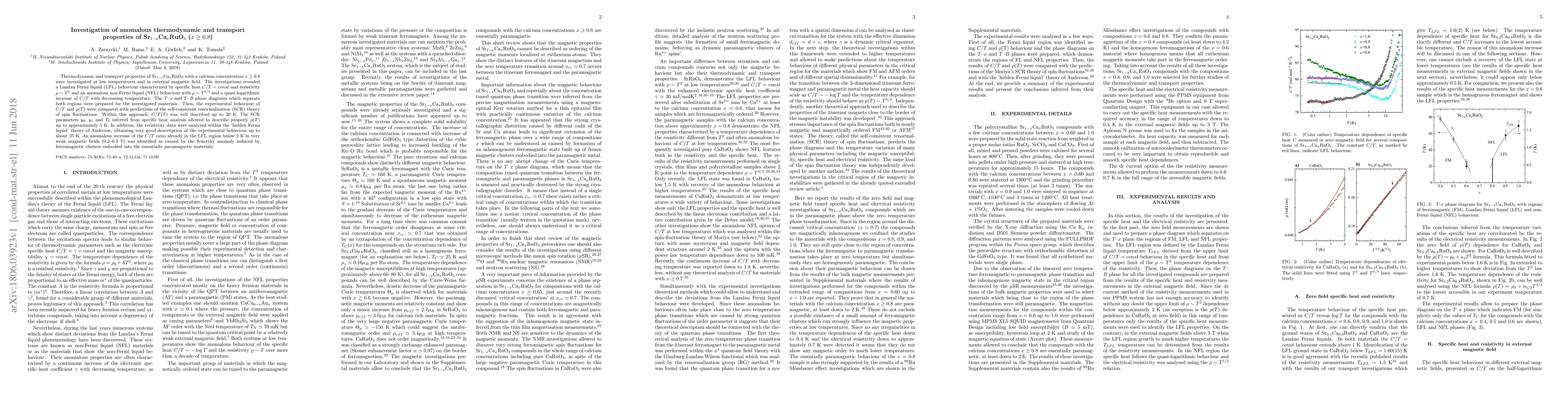 Researchers investigated Sr$_{1-x}$Ca$_x$RuO$_3$, a material with unusual thermodynamic and transport properties at low temperatures and in external magnetic fields. The study revealed two regimes: one following Landau Fermi liquid behavior and the other an anomalous non-Fermi liquid behavior, which were compared to predictions of spin fluctuation theories.