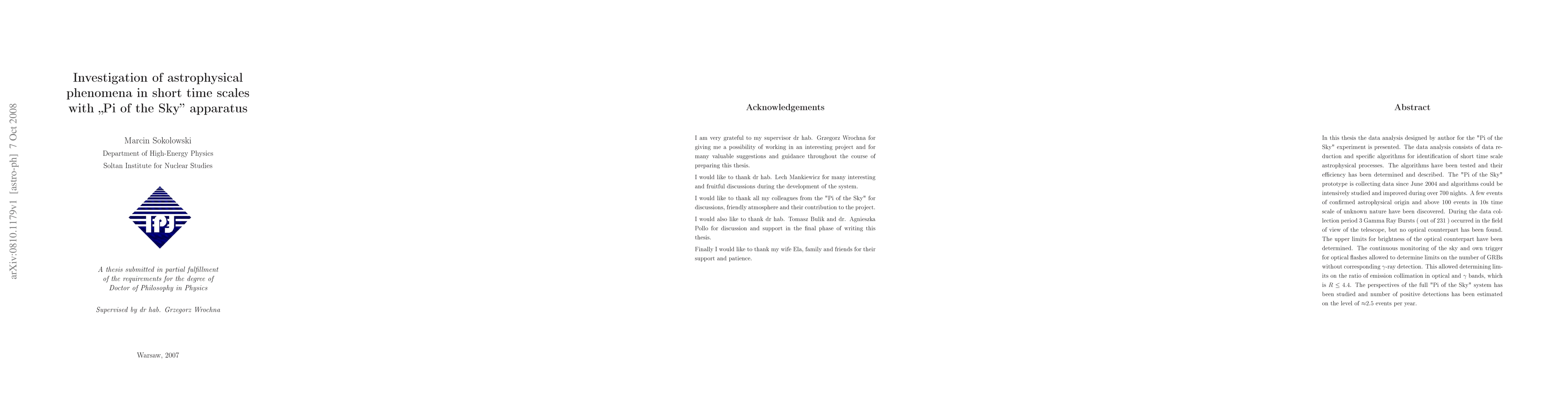 In this thesis the data analysis designed by author for the "Pi of the Sky" experiment is presented. The data analysis consists of data reduction and specific algorithms for identification of short time scale astrophysical processes. The algorithms have been tested and their efficiency has been determined and described. The "Pi of the Sky" prototype is collecting data since June 2004 and algorithms could be intensively studied and improved during over 700 nights. A few events of confirmed astrophysical origin and above 100 events in 10s time scale of unknown nature have been discovered. During the data collection period 3 Gamma Ray Bursts (out of 231) occurred in the field of view of the telescope, but no optical counterpart has been found. The upper limits for brightness of the optical counterpart have been determined. The continuous monitoring of the sky and own trigger for optical flashes allowed to determine limits on the number of GRBs without corresponding gamma-ray detection. This allowed determining limits on the ratio of emission collimation in optical and gamma bands, which is R >= 4.4. The perspectives of the full "Pi of the Sky" system has been studied and number of positive detections has been estimated on the level of ~ 2.5 events per year.